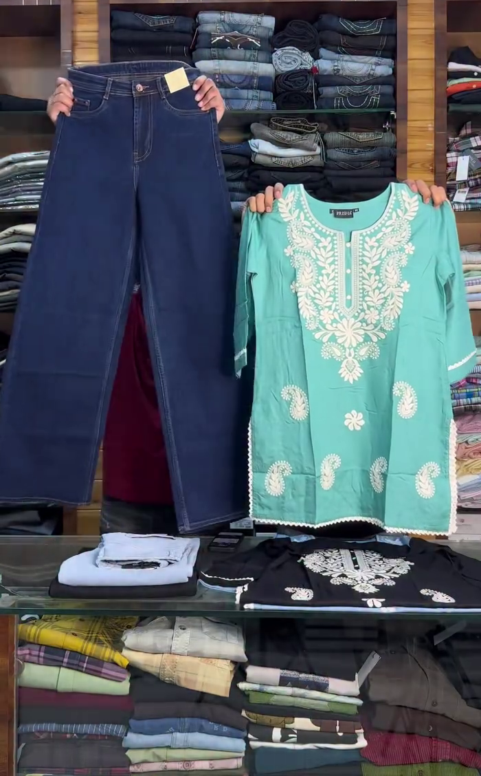 Paired with this is a trendy light blue flared denim jeans 👖, giving you that perfect Indo-western fusion look. The high-quality denim ensures durability while maintaining a soft and comfortable feel throughout the day. The slight flare at the bottom adds a modern twist, making your silhouette look taller and more graceful ✨