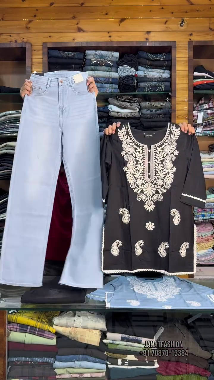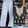 Upgrade your wardrobe with this stunning fusion set that blends traditional charm with modern flair! 💫 This outfit features a beautifully crafted black embroidered kurti paired with chic light-wash flared jeans — the perfect combo for effortless style and comfort.