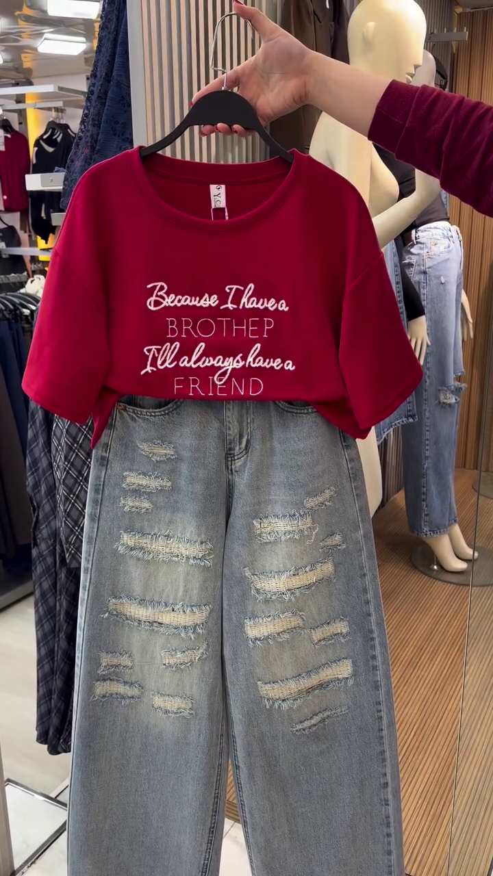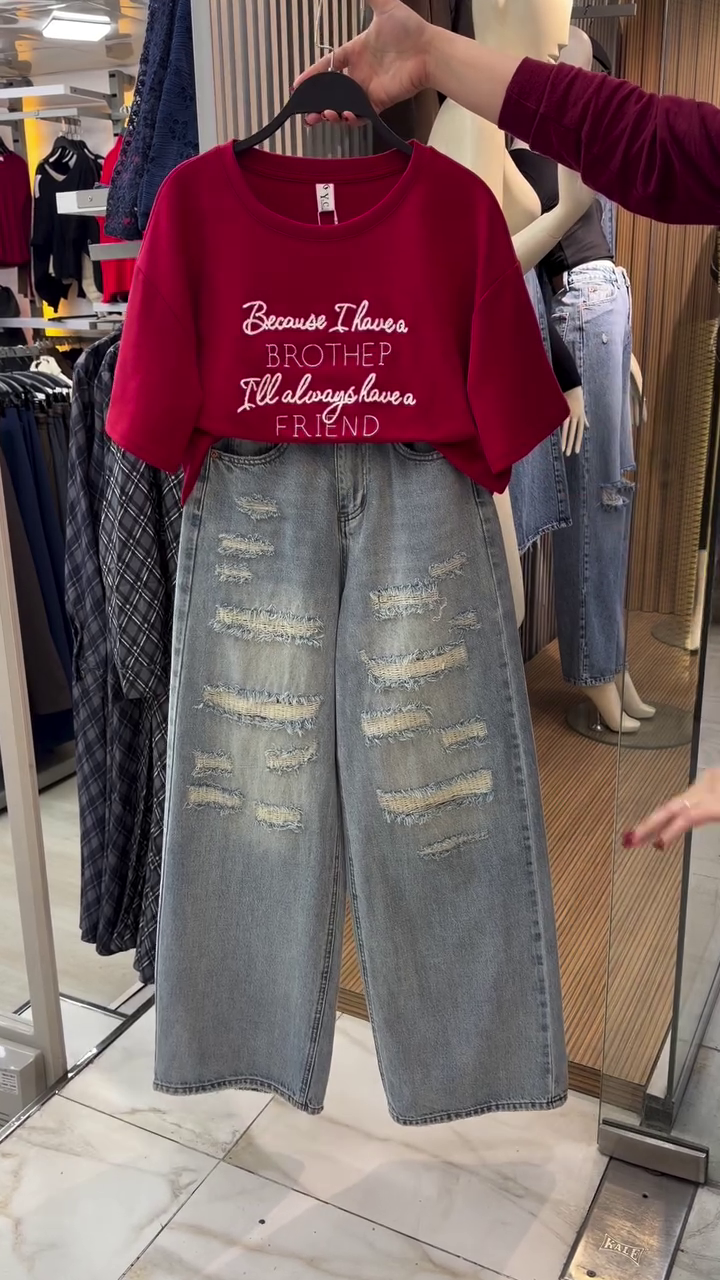 Paired with trendy wide-leg distressed denim jeans ππ₯, this set brings in that bold, street-style energy. The ripped detailing adds a rugged, fashionable edge, while the loose fit offers ultimate comfort and movement π. Together, the combo creates a perfect balance of cute and cool β¨.