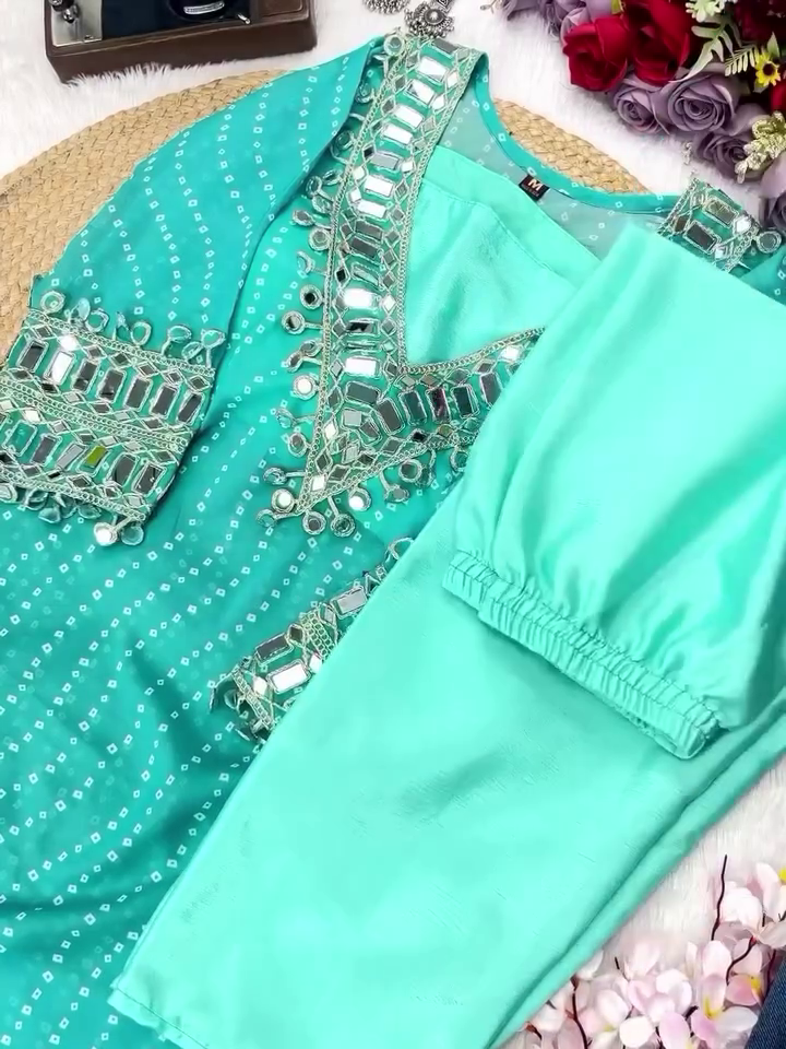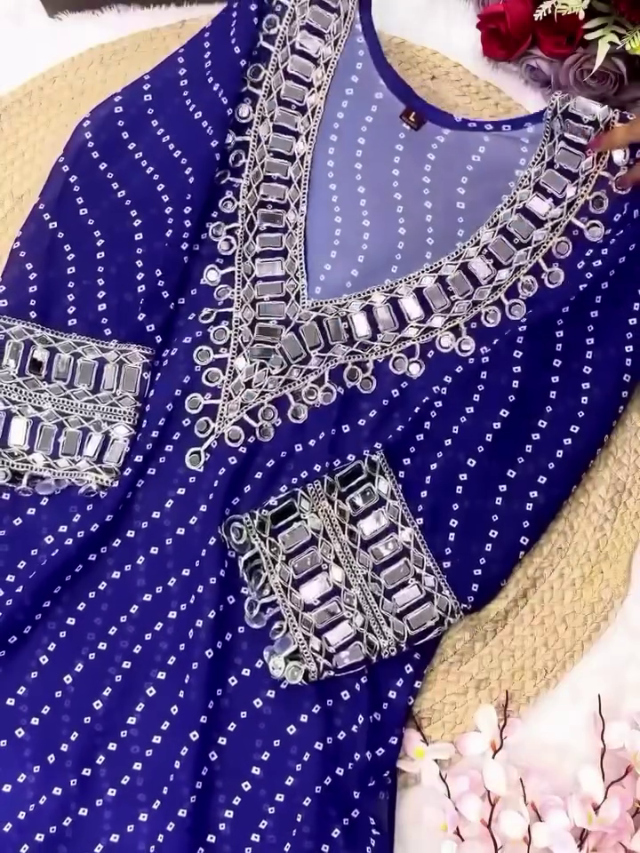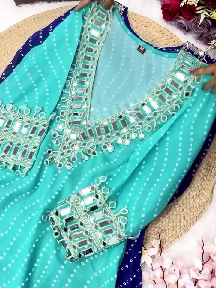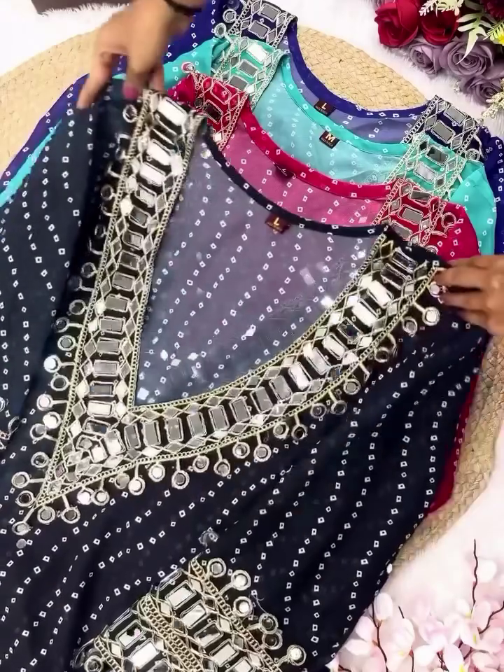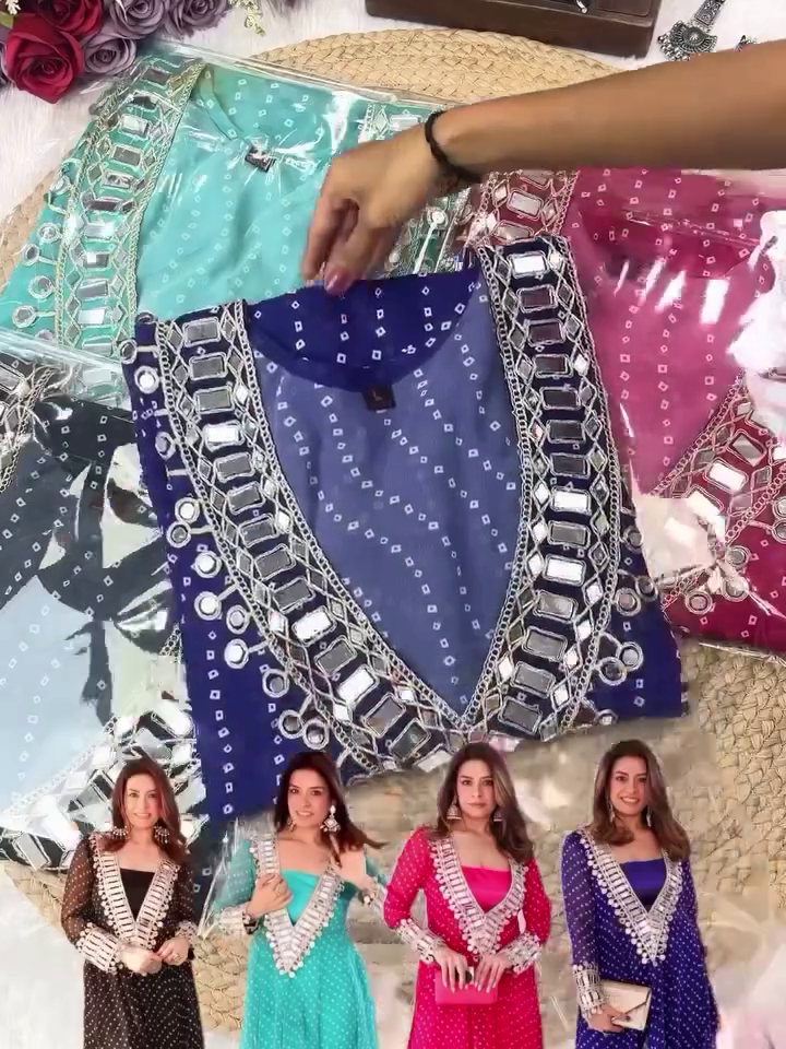 Step Into The Spotlight With Our Exquisite Designer Bandhej Mirror Work Anarkali Kurta Set, A Celebration Of Timeless Craftsmanship And Modern Elegance. Inspired By Indiaβs Rich Textile Heritage, This Ethnic Masterpiece Blends Traditional Bandhej Patterns With Dazzling Mirror Work And Heavily Embellished Details To Offer A Regal Festive Ensemble.