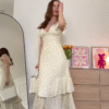 This enchanting blush pink maxi dress is pure spring magic, crafted from sheer chiffon printed with delicate oversized florals in soft pinks and whites that sway beautifully with every step! 🌸💖 Featuring seductive spaghetti straps, a sweetheart corset bodice for that perfect cinch, romantic ruffle frills on straps and tiers, and a flowing multi-layered skirt that pools gracefully at the ankles – it’s the ultimate blend of boho chic and feminine allure! 😍👠 Ideal for beach weddings, garden parties, brunches, date nights, or vacations where you want to feel like a blooming goddess. 🌿☀️