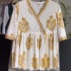 The top features a wrap-style silhouette, highlighted with a mustard floral block print that blooms beautifully over an ivory base. The intricate border embroidery and dainty tie-up detail at the waist add a handcrafted touch that feels effortlessly feminine 💛. The airy cotton fabric ensures comfort all day long — breathable, soft, and soothing against the skin.