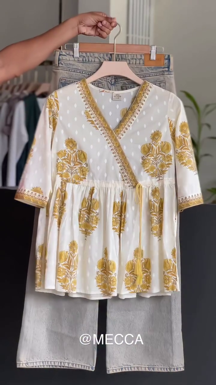 Bring home the timeless beauty of Indian artistry with our Golden Petal Wrap Kurta Top, paired with soft ivory trousers 🌼✨. This ensemble is where heritage meets modern minimalism — a perfect reflection of quiet luxury and understated grace.