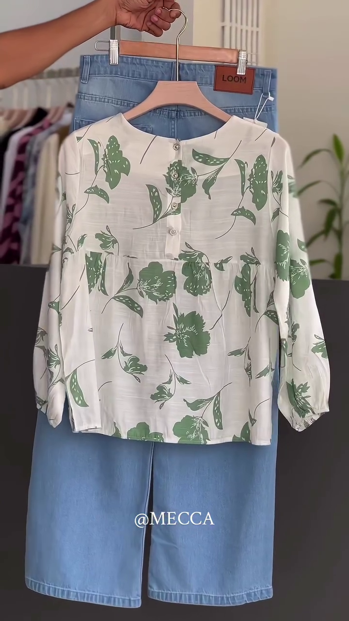 Breathe in the calm and freshness of nature with our Sage Meadow Floral Top, styled with cool Sky Blue Wide-Leg Denims 🍃💙. A reflection of serenity and effortless style, this look is perfect for those who adore clean aesthetics with a playful twist.