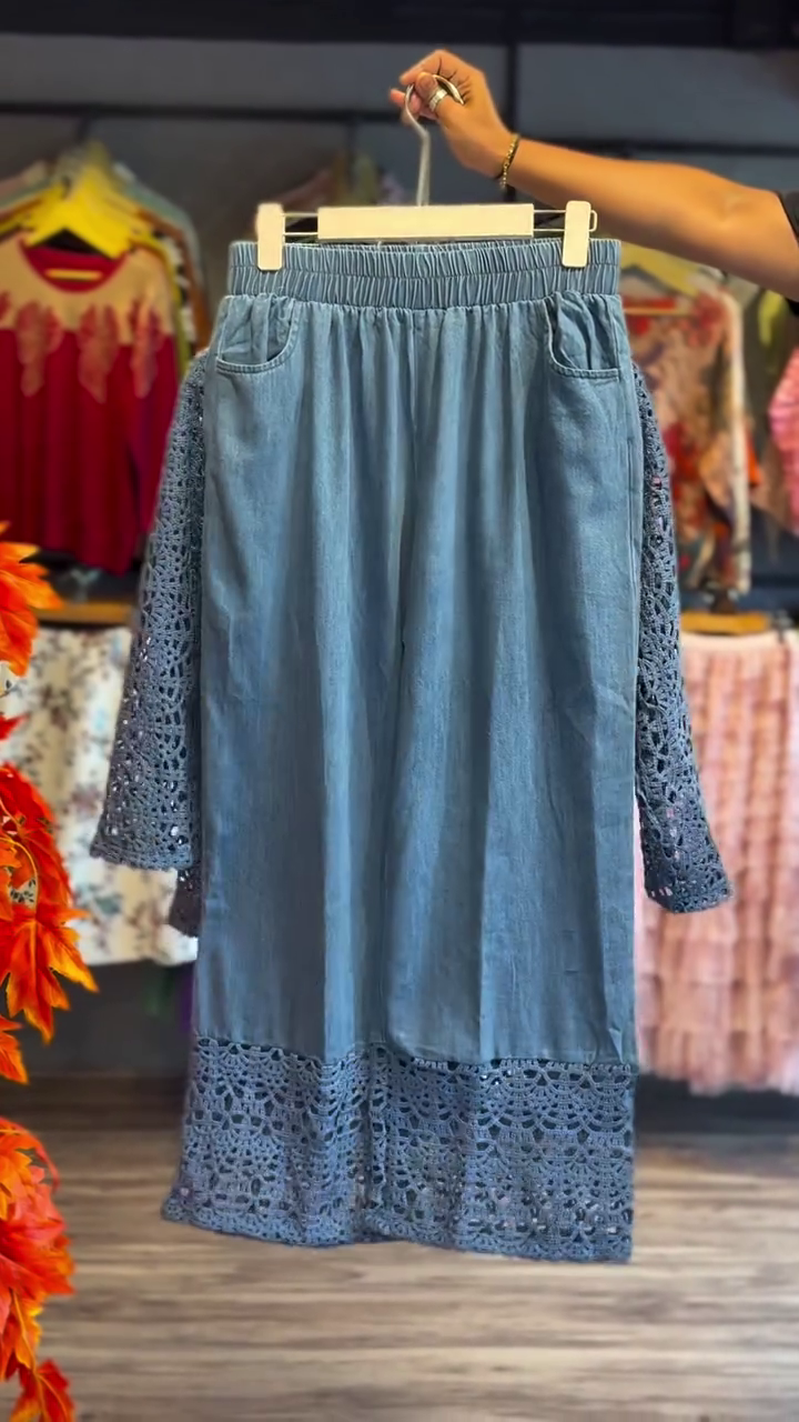 The Azure Lace Harmony Denim Co-ord Set is a beautiful blend of vintage denim and intricate lace artistry 💙. Designed for the modern woman who loves subtle sophistication, this set features a button-down denim tunic top with exquisite crochet lace detailing along the hem and sleeves.
