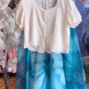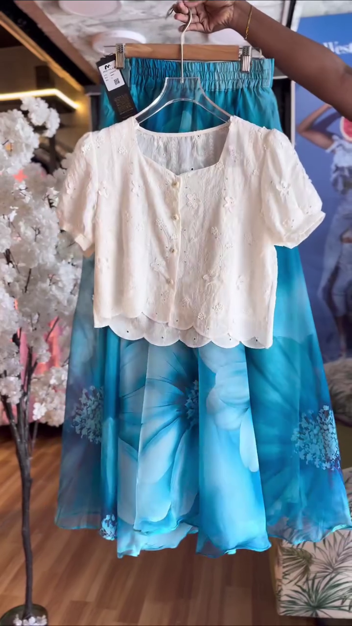 Channel breezy elegance with this Cream Lace Crop Blouse and Ocean Blue Floral Skirt Set, a vision of seaside serenity and festive flair. 🌊 The cream blouse, designed in intricate lace fabric, features delicate floral embroidery and scalloped hems, adding an ethereal vintage charm.