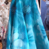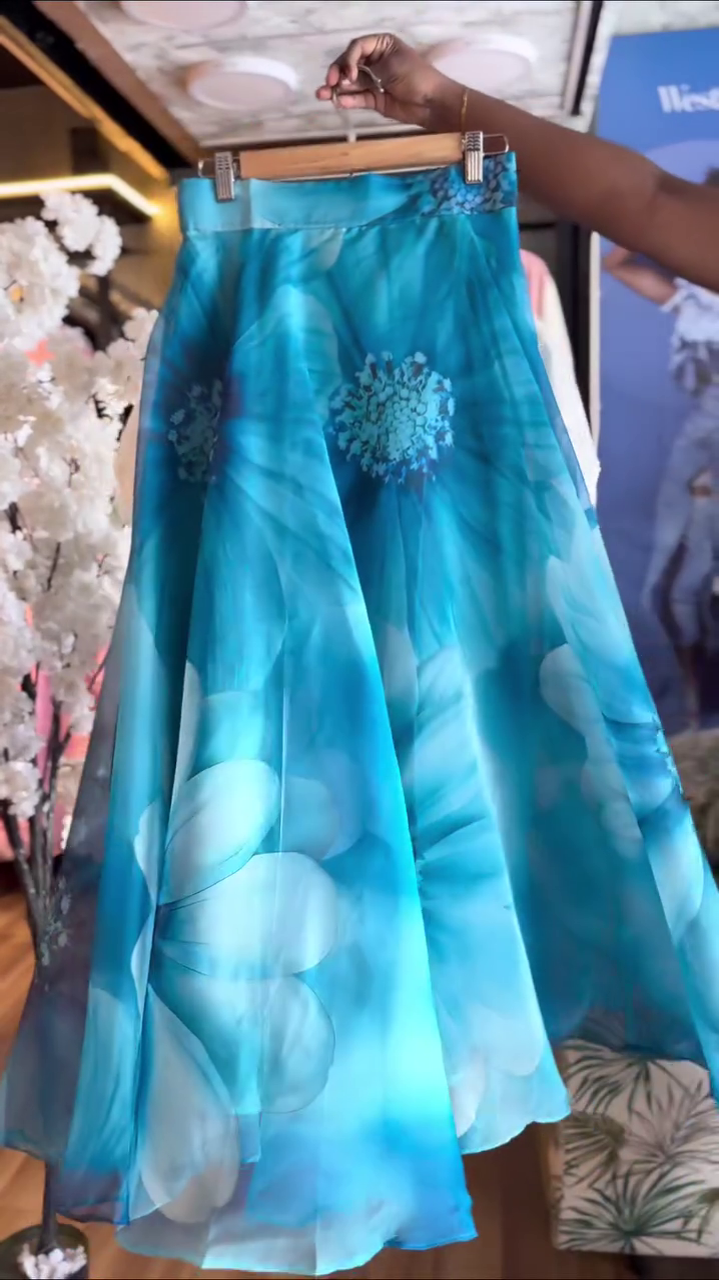 Vibrant ocean-blue skirt with gradient floral motifs.