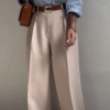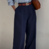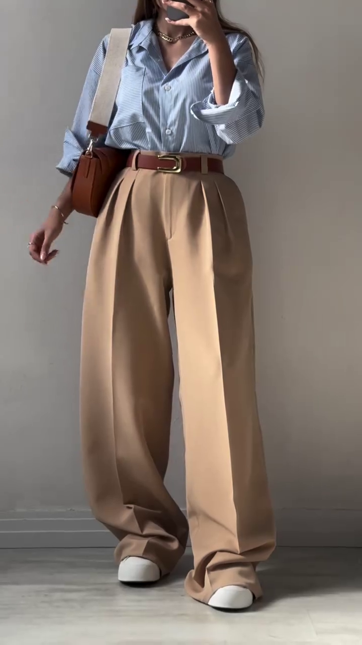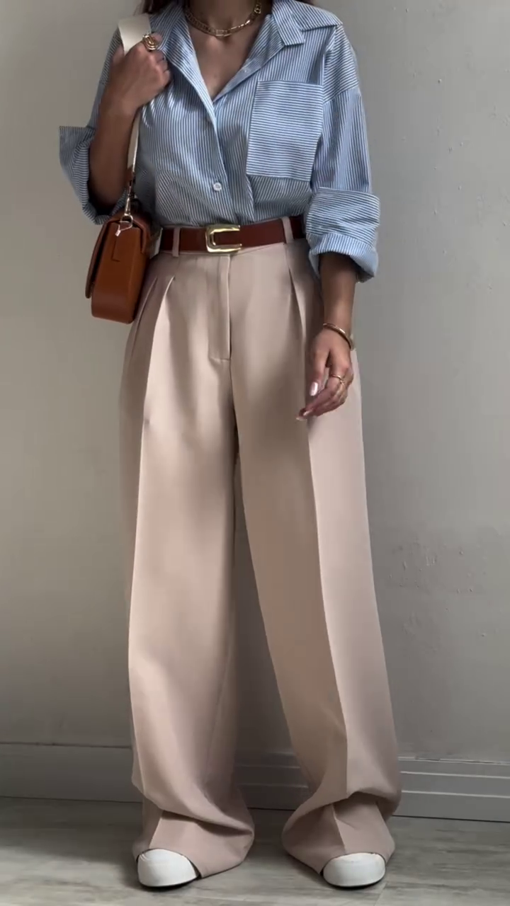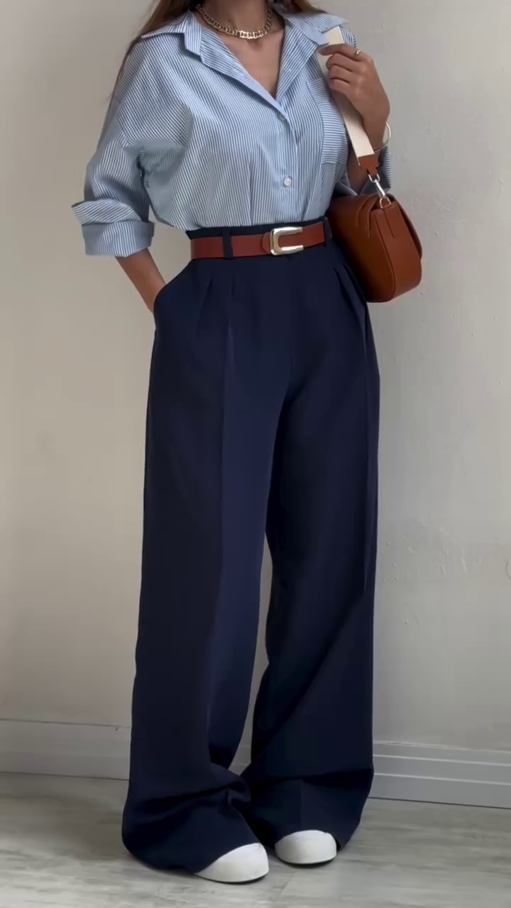 The sky-blue striped shirt features a soft collar and effortless drape, exuding timeless charm. It’s perfectly paired with high-waisted navy wide-leg trousers that elongate your frame and create a powerful yet graceful silhouette 🌆.