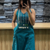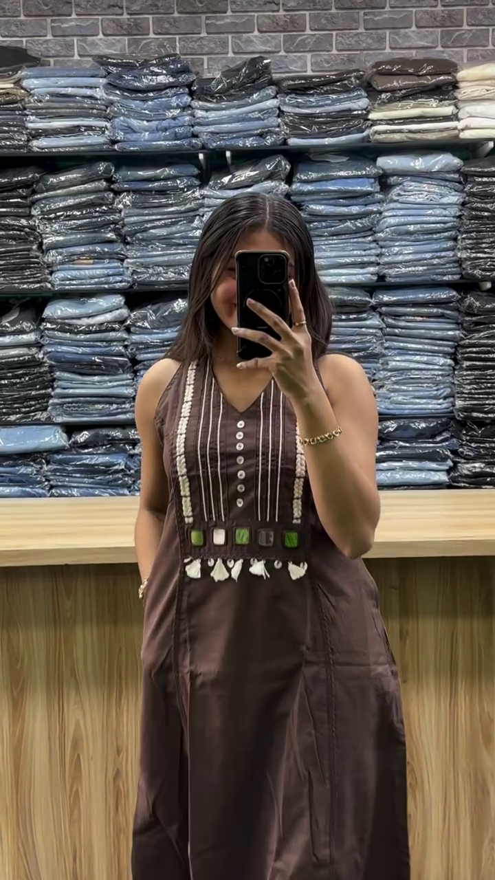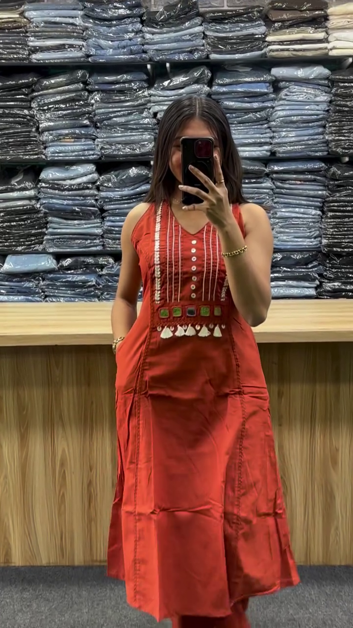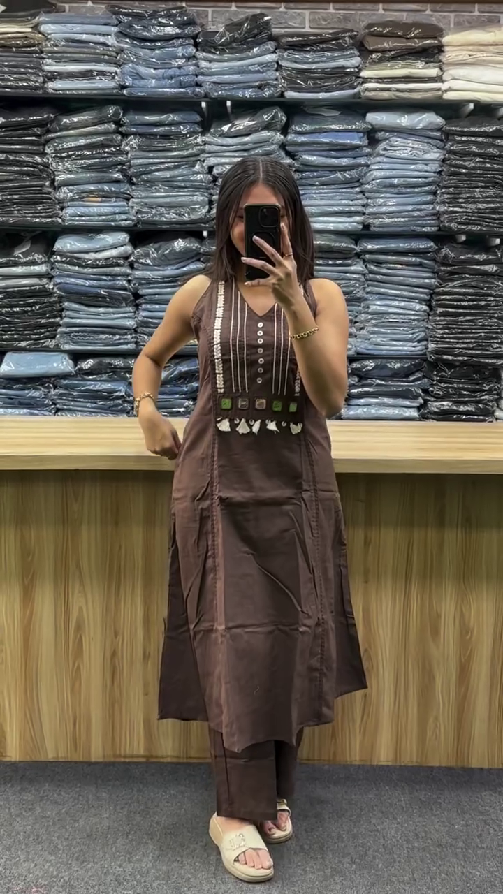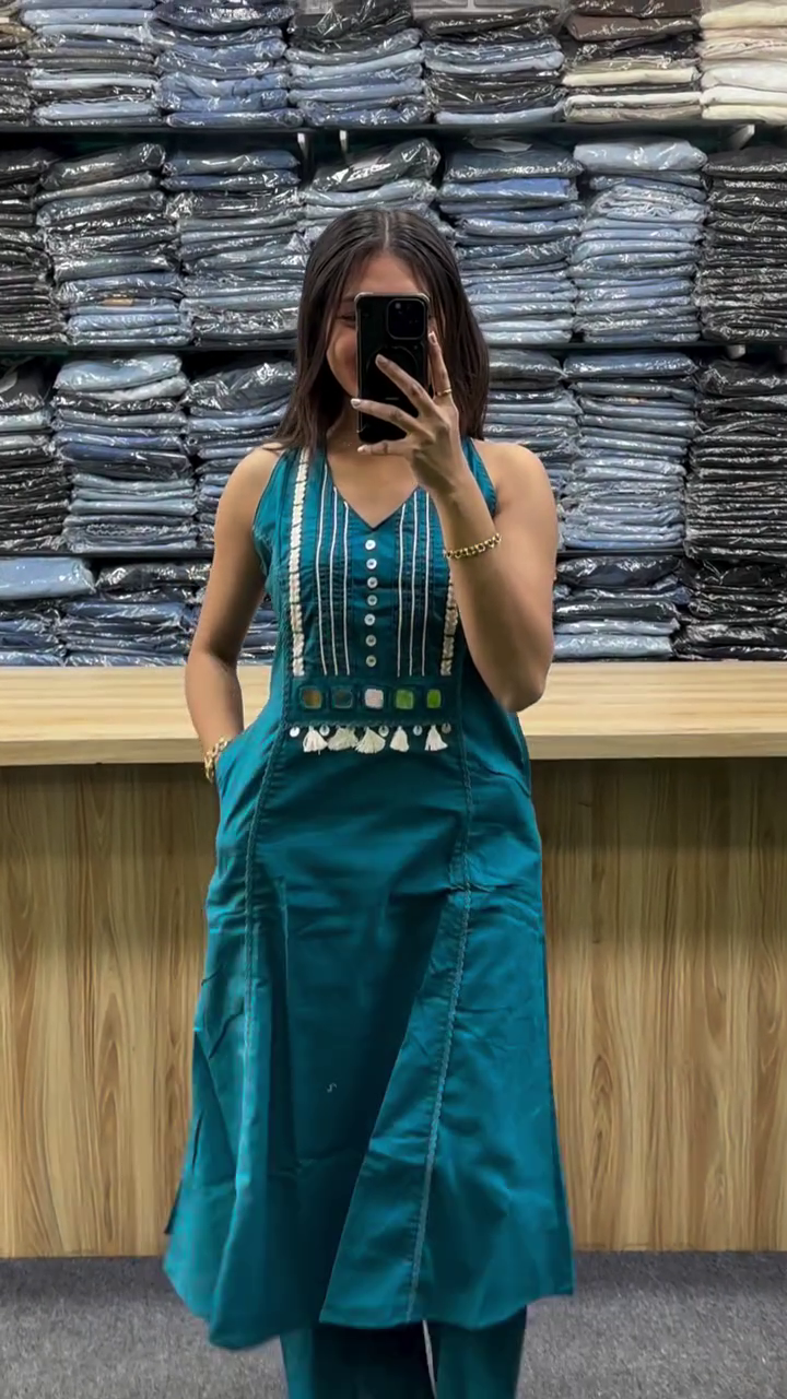 Crafted in a rich emerald green tone πŸ’šπŸŒˆ, this kurta set radiates freshness and sophistication. The sleeveless kurta features a stylish V-neckline with button detailing πŸ”˜βœ¨, adding a subtle yet classy touch. The highlight of this piece is the vertical thread work and mirror-inspired accents on the front panel πŸŒŸπŸ’«, which beautifully enhance the overall look without overpowering it.