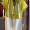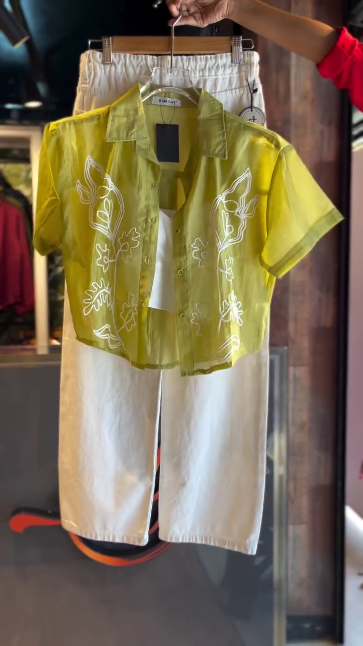 The outfit features a lime-yellow sheer shirt crafted from a premium organza-cotton blend, allowing just the right touch of transparency for a modern, flirty edge. π« The fabric feels airy and light, making it ideal for warm-weather days or tropical escapes. Embellished with delicate white thread embroidery, the shirt showcases intricate floral and abstract patterns β a nod to natureβs effortless beauty. πΈ The cropped silhouette and short sleeves give it a youthful, contemporary flair, while the collared neckline keeps it polished.