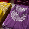 The deep royal purple fabric is adorned with elegant white elephant and floral mandala prints, symbolizing prosperity and grace 🐘. The neckline is beautifully detailed with delicate mirror-style embroidery, adding a subtle shimmer that enhances its festive appeal.