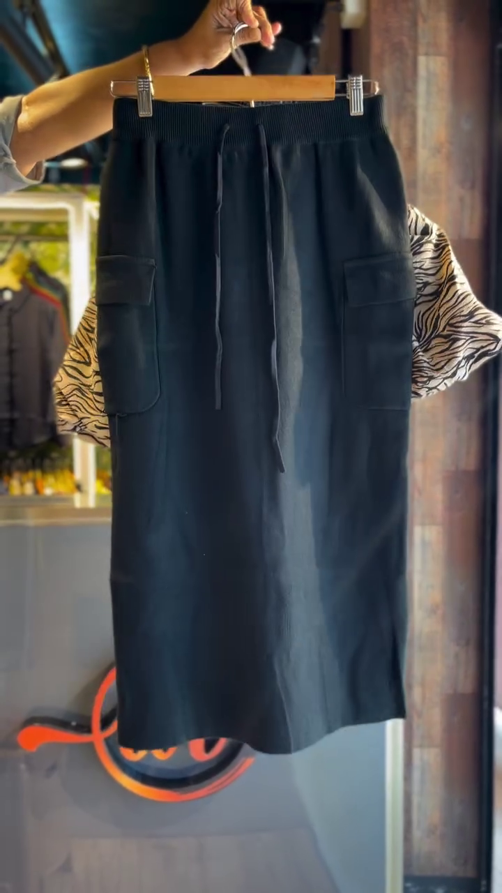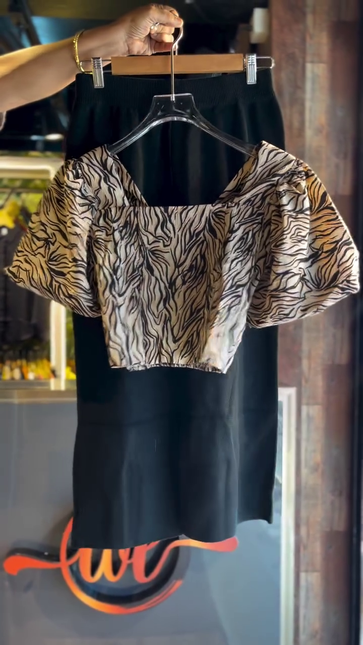 The high-waisted black skirt pairs perfectly with the top, balancing the wild energy of the print with sleek sophistication. Its soft stretch material hugs gently without restricting movement, making it as comfortable as it is stylish. 🖤