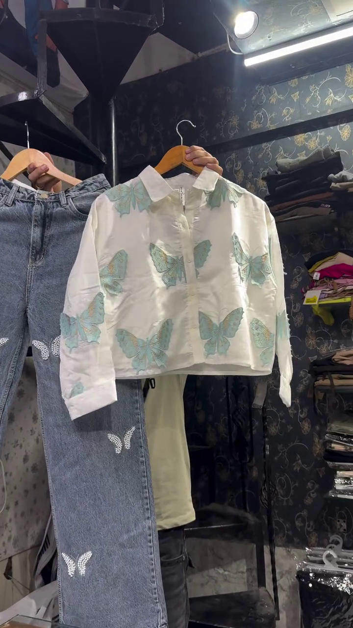 The highlight of this outfit is the beautiful white crop shirt π€ featuring delicate pastel butterfly prints ππ¦ that add a dreamy, aesthetic touch. Crafted from lightweight, breathable fabric πΏπ¬οΈ, it feels soft on the skin and keeps you cool and stylish. The structured collar and button-down design π give it a polished look, while the cropped fit adds a trendy edge π₯.