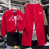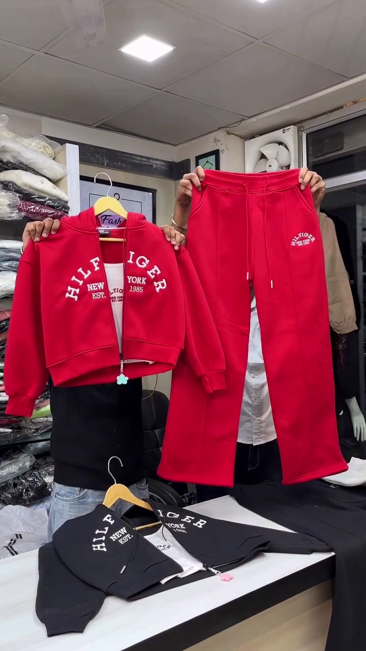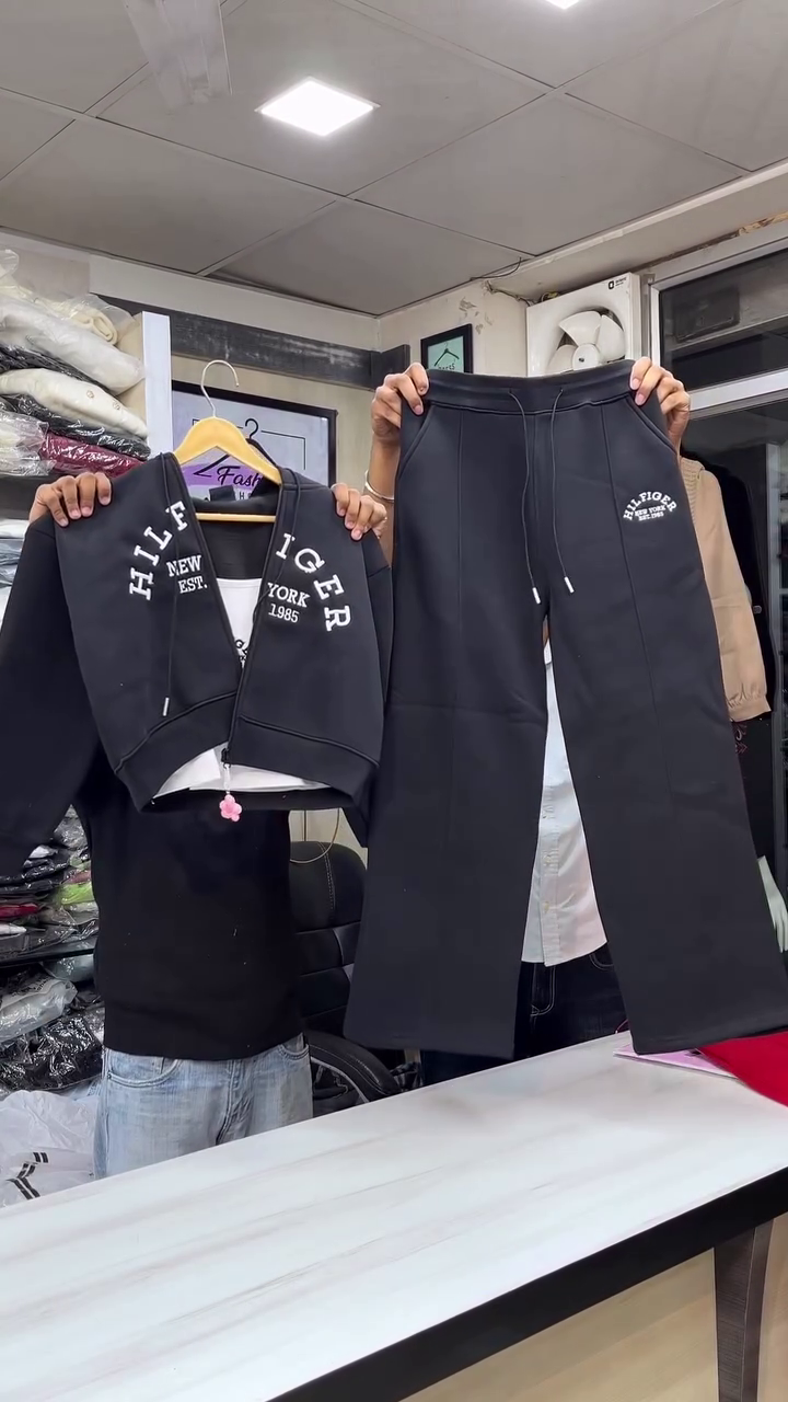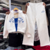 This all‑white hoodie and jogger co‑ord set 🤍 is a clean, sporty option for everyday style. The hoodie has a relaxed fit with a zip front, drawstring hood, and ribbed cuffs for snug comfort. Blue varsity‑style lettering and chest detail 💙 add a pop of color and a sporty college vibe while keeping brand names out of focus. The matching straight‑leg joggers feature an elastic waistband with drawstring and subtle logo‑style text near the pocket area, giving a coordinated, polished athleisure look. Ideal for airport outfits, walks, or casual hangouts. Pair the set with chunky sneakers and a cap for a cool, effortless streetwear feel.