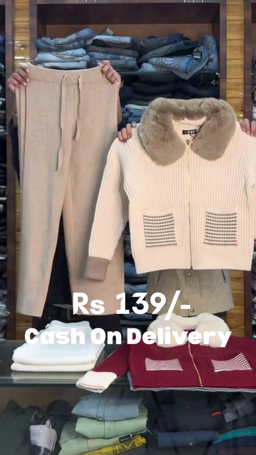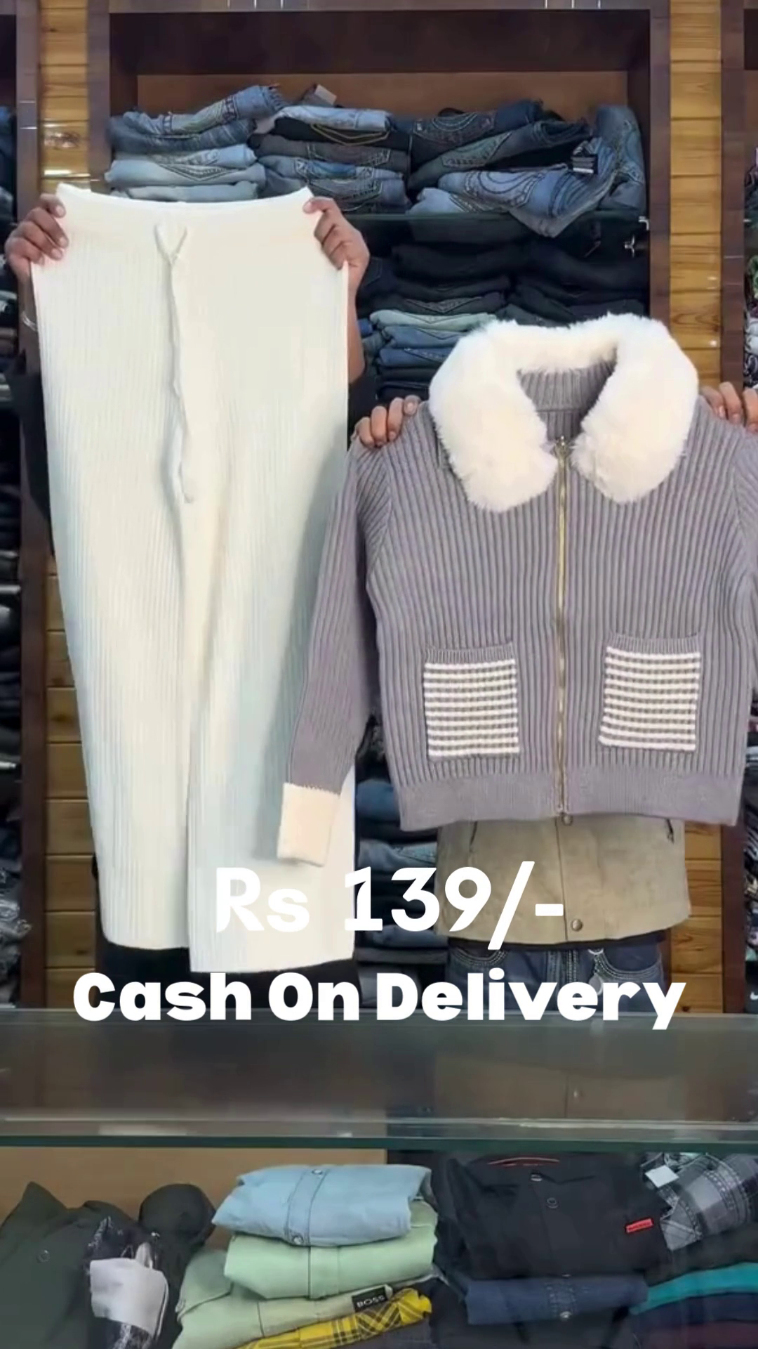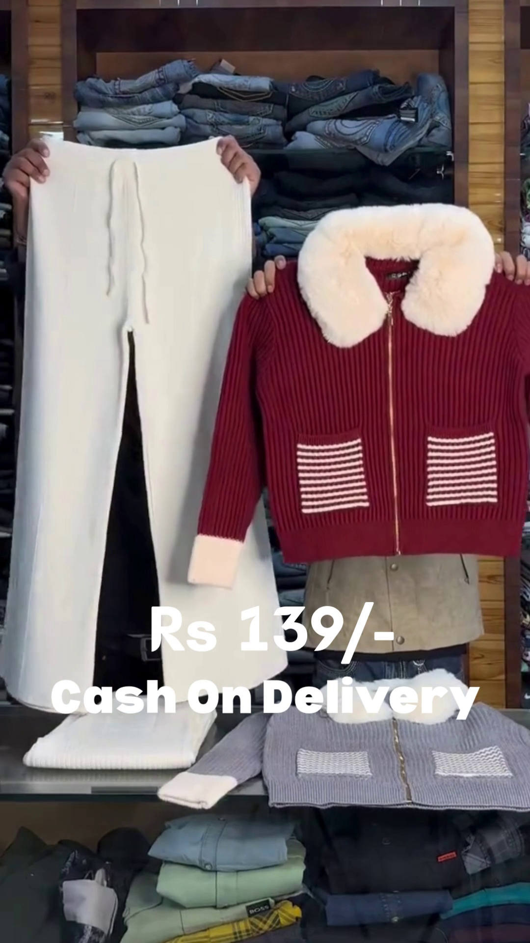 This cozy two‑piece set features a black ribbed knit zip‑up jacket 🖤 with a luxurious white faux fur collar, giving a chic winter‑ready vibe. The jacket has full sleeves, a front gold zip, and striped patch pockets in contrast knit, adding both style and practicality. Paired with it are soft white knit jogger pants 🤍 that offer comfort and warmth with a flattering slim‑straight fit. Together, the set is perfect for winter outings, shopping, travel, or relaxed evenings while still looking put‑together. The monochrome color palette makes accessorizing easy—just add boots or sneakers and a cute bag. This outfit brings both comfort and style, ideal for those who love coordinated sets. ❄️