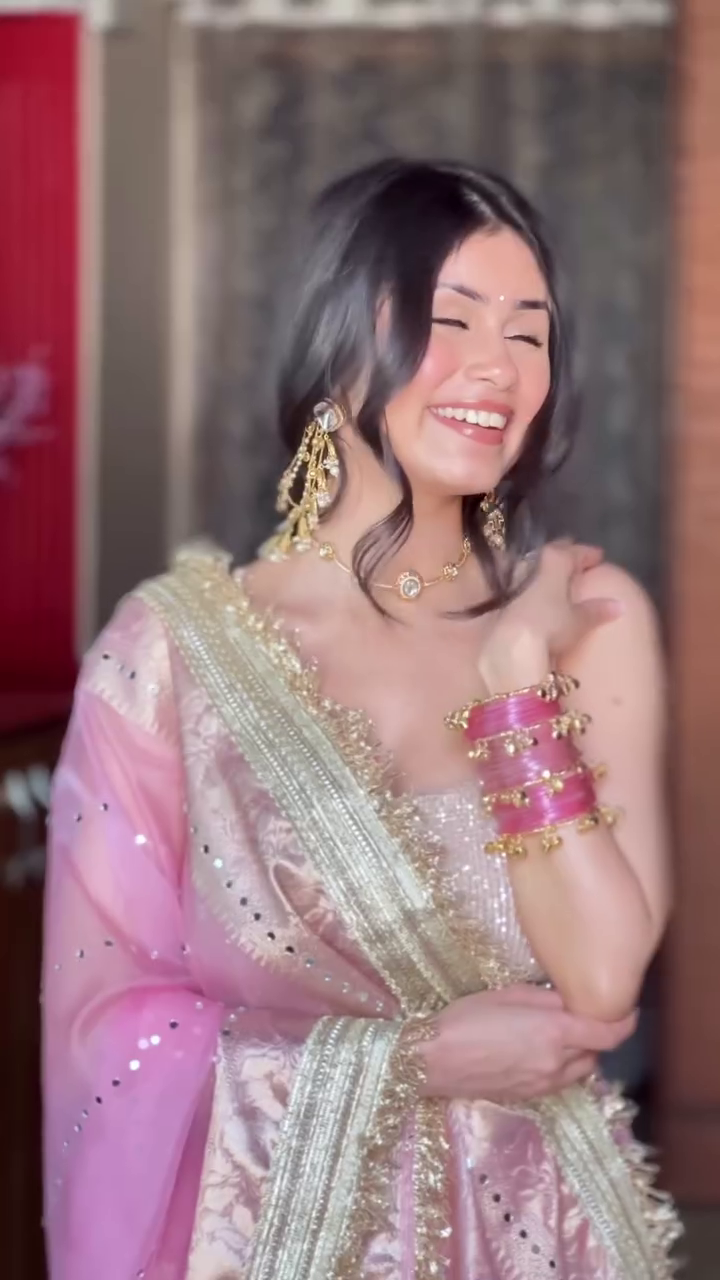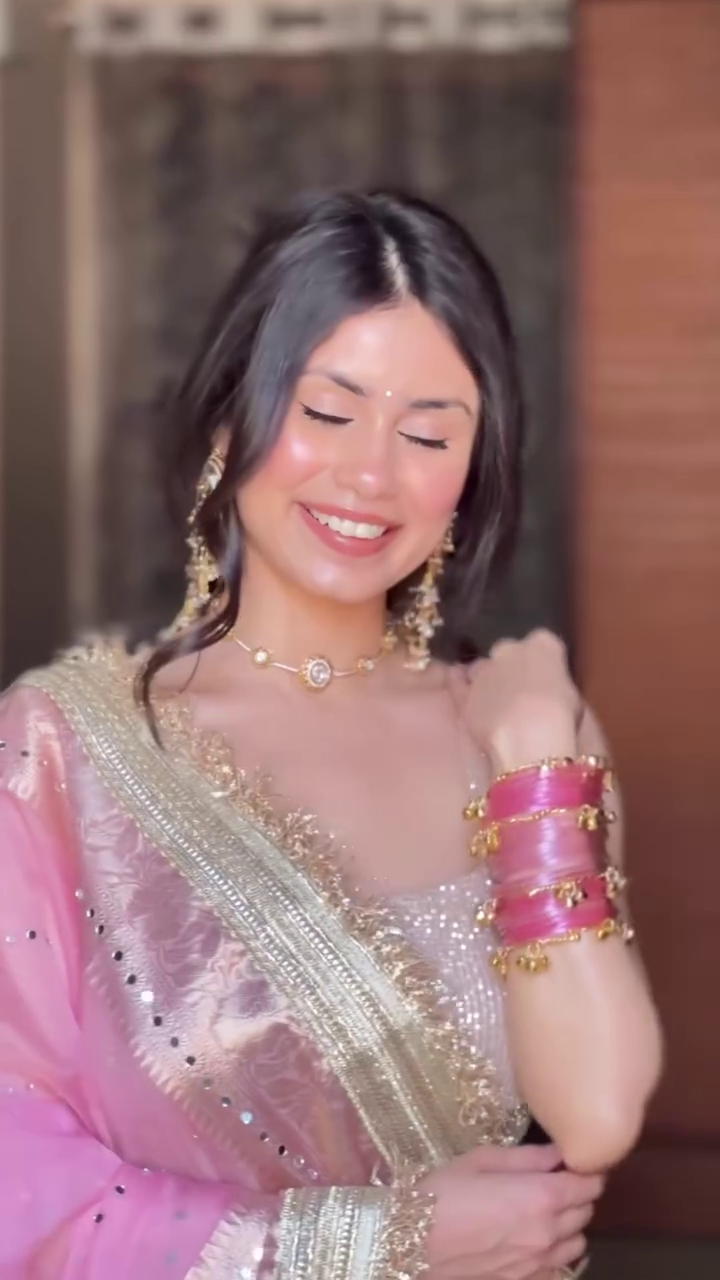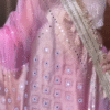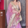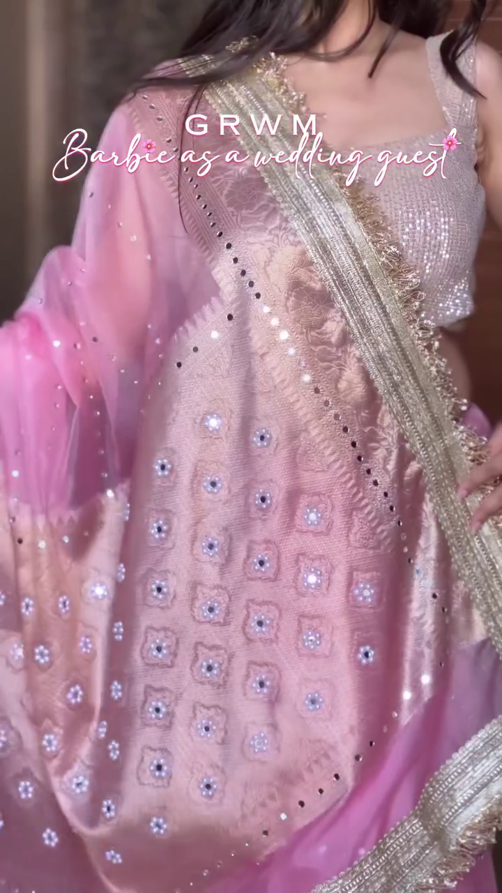 The pallu carries matching zari embroidery with textured finishing 🌸 making it perfect for graceful draping. The soft flow of the fabric ensures elegant fall and fluid movement while walking 💃. The pastel pink tone blended with champagne undertones creates a royal yet feminine aesthetic 🎀.
