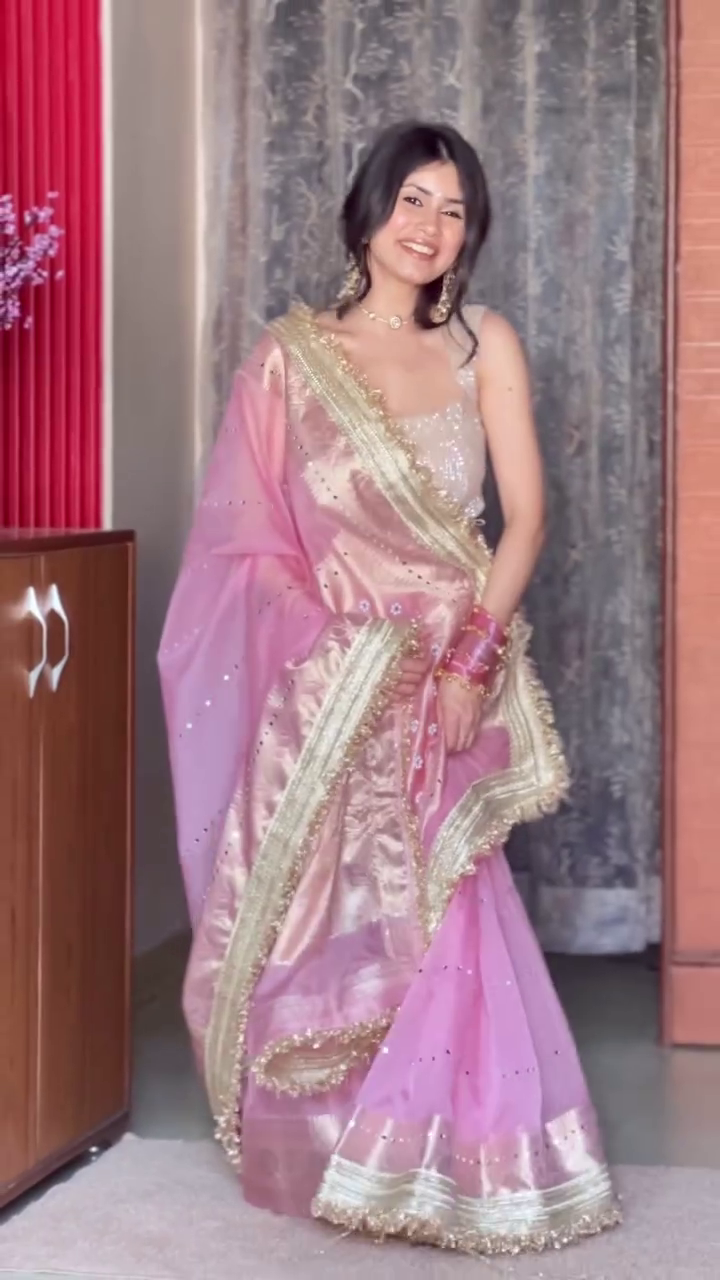 This elegant blush pink dual-tone saree 💗✨ features a luxurious silk blend base with a soft sheen finish that reflects light beautifully 🌟. The body showcases delicate scattered sequin embellishments 💎 adding subtle sparkle without overpowering the look. The highlight of this saree is its heavy gold zari embroidered border 👑 intricately crafted with traditional detailing and fine thread artistry, giving it a rich wedding-ready appeal.