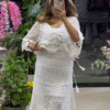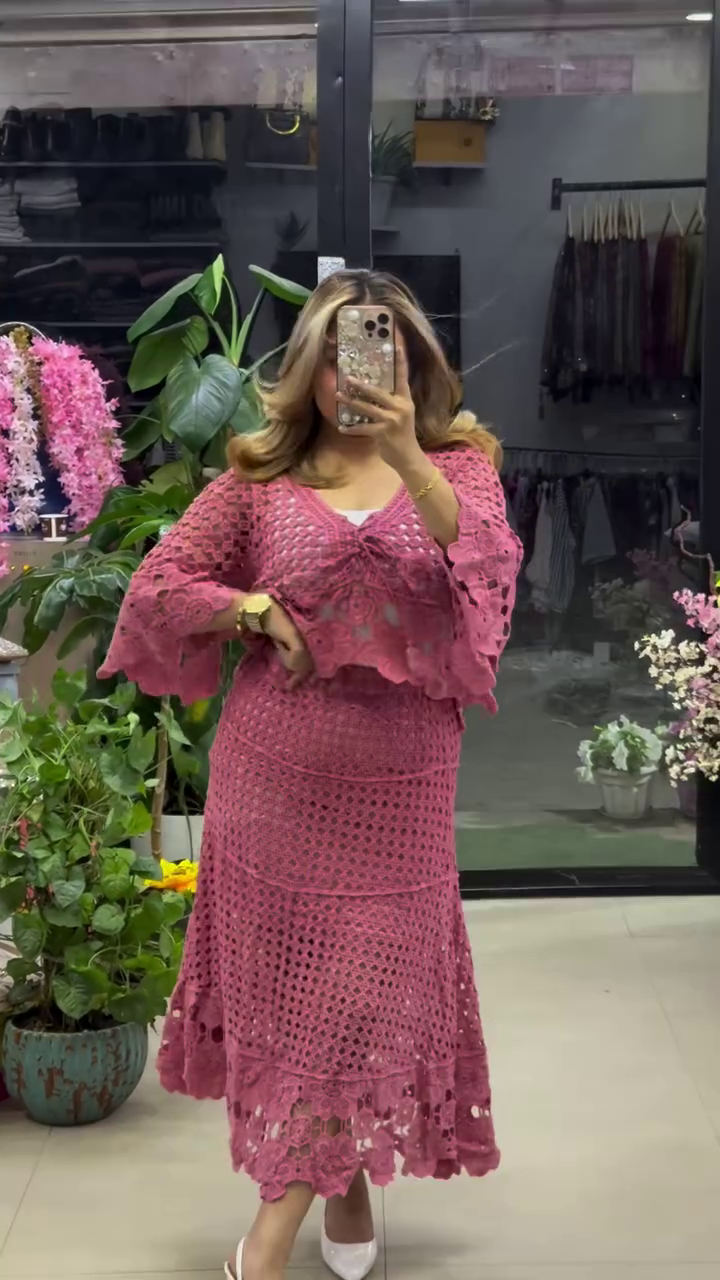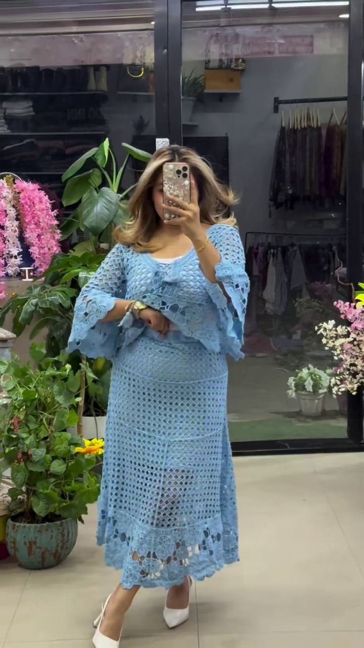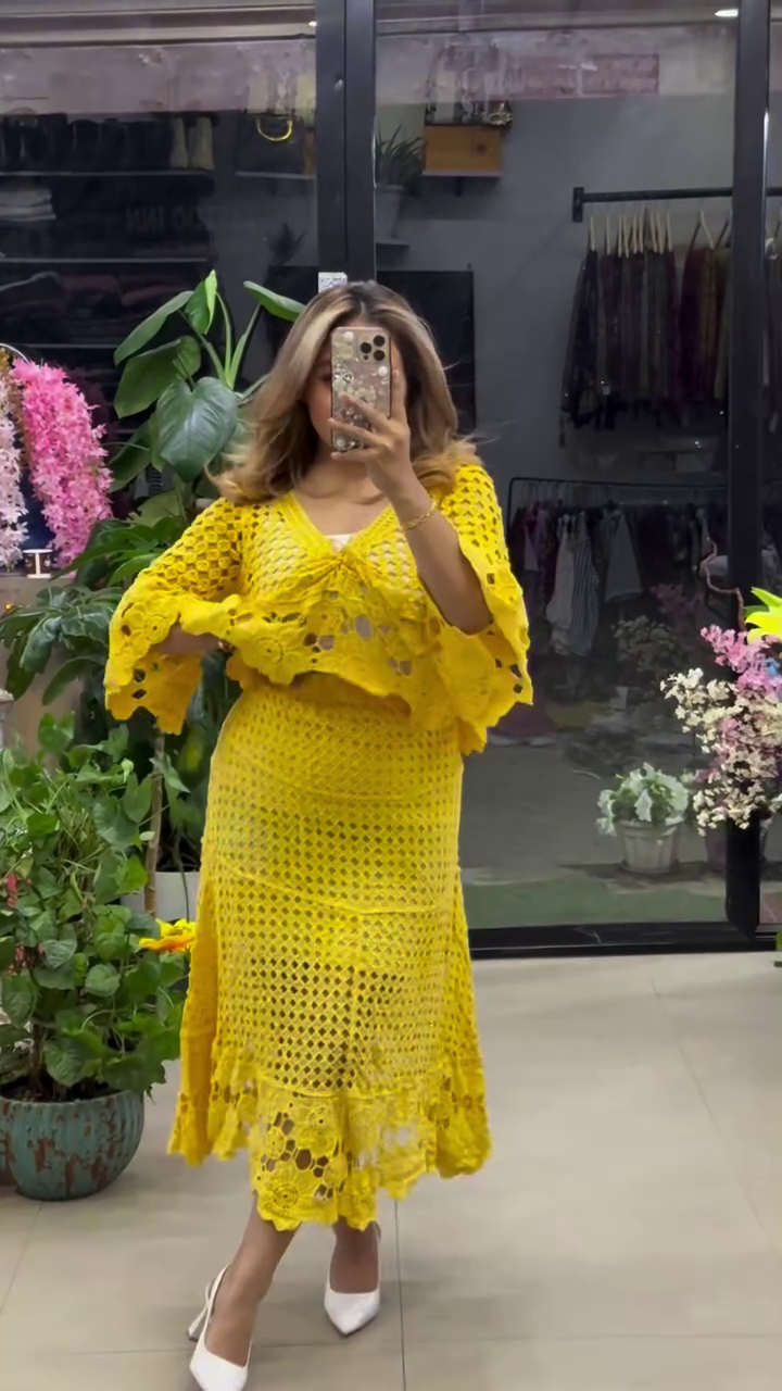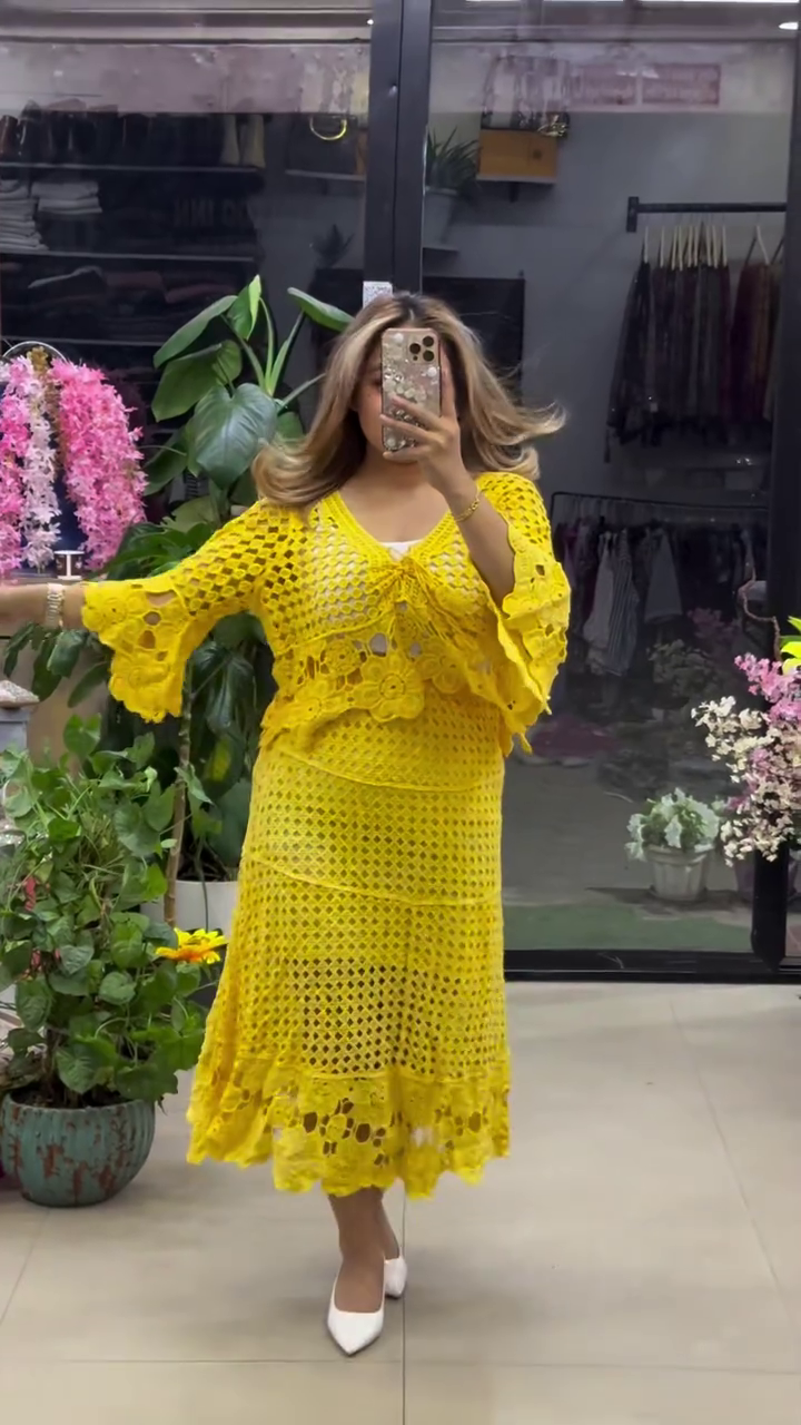 This eye-catching sunflower yellow crochet lace outfit πŸŒ»πŸ’› features intricate open-knit detailing throughout 🌼. The top includes flared bell sleeves πŸ”” and a fitted waist for a flattering feminine shape πŸ’ƒ. The matching skirt falls gracefully with a delicate scalloped hem ✨, offering a stylish layered effect. Designed with soft inner lining 🀍 for comfort and coverage, this outfit is perfect for vacations πŸ–οΈ, resort wear 🌊, festive gatherings πŸŽ‰, and statement styling 🌟.