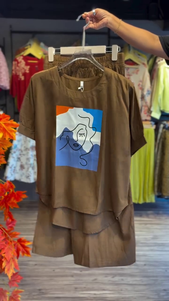 Add a splash of artistic flair to your wardrobe with this Contemporary Brown Co-ord Set, featuring a short-sleeve top and matching shorts in a soft, breathable fabric. The front of the top showcases a vivid abstract face print in bold shades of orange, blue, and white β€” a true statement of modern minimalism and creativity. πŸŒˆπŸ–ŒοΈ