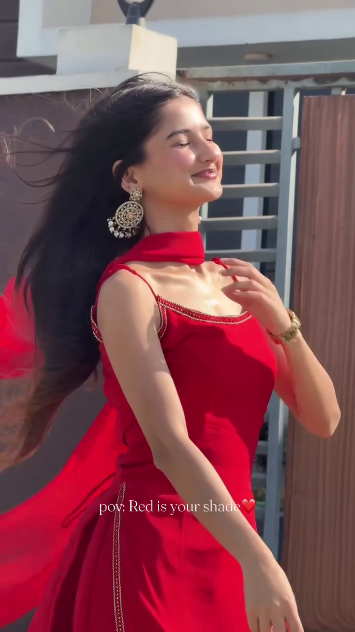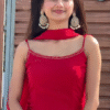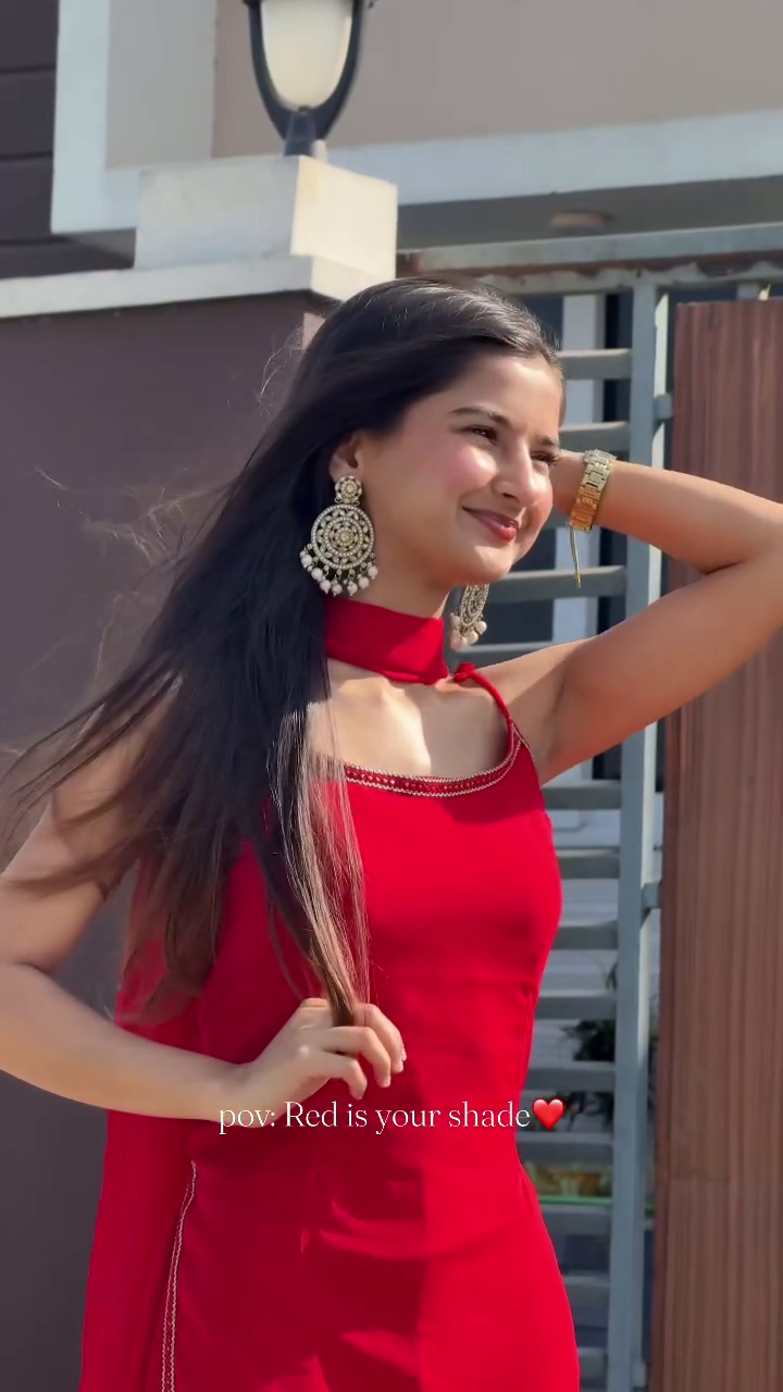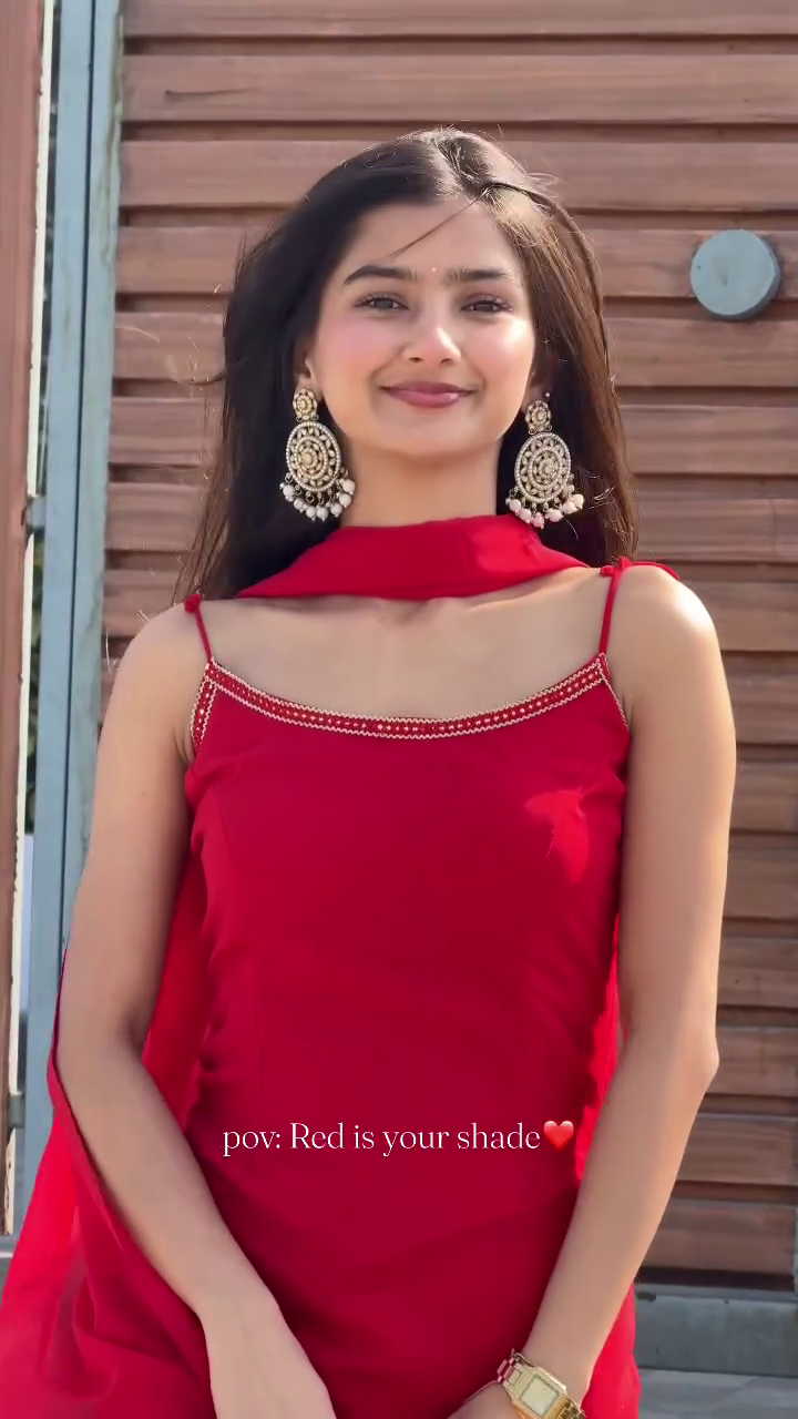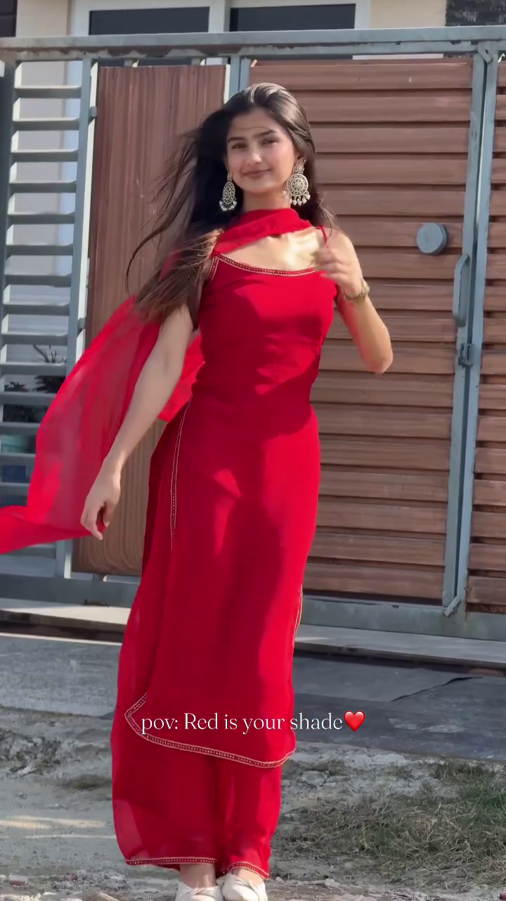 Elegant bright red straight kurta โค๏ธ with delicate neckline detailing โจ and sleek silhouette. Paired with matching palazzo pants ๐ and sheer lightweight dupatta ๐ฌ๏ธ.
