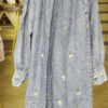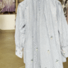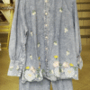 The acid-wash denim shirt offers a soft faded texture that gives it a trendy vintage vibe . The puff sleeves with gathered cuffs create a feminine silhouette while maintaining a relaxed casual style . Small embroidered daisy flowers are scattered across the shirt, adding charming floral accents .
