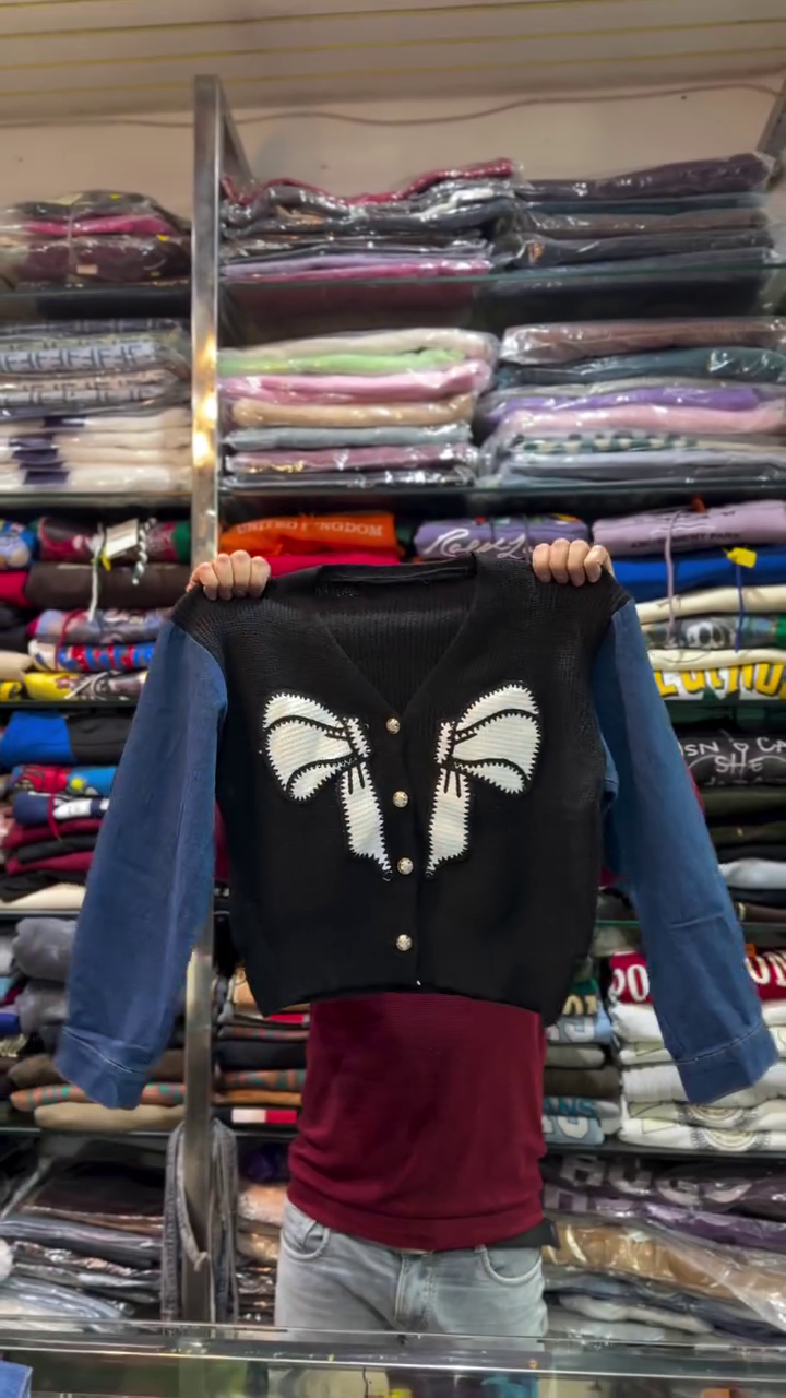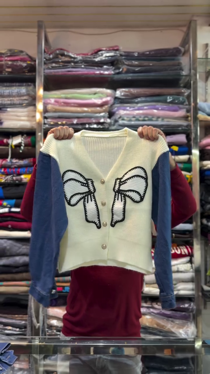 This playful knit cardigan 🤍💙 features a cream body with denim‑blue sleeves for a fun color‑blocked effect. On the front, two oversized bow motifs 🎀 in contrasting black and white embroidery create a bold, cute statement that instantly grabs attention. The V‑neckline is flattering and perfect for layering over tops or dresses, while the front is finished with shiny buttons that add a touch of elegance. The knit fabric is soft and cozy, ideal for cooler days in autumn and winter. The slightly cropped length pairs beautifully with high‑waist jeans, skirts, or wide‑leg trousers. Wear it to college, brunch, or casual outings to show off your unique style. Pair with sneakers or ankle boots and minimal accessories to let the bows stand out. ✨