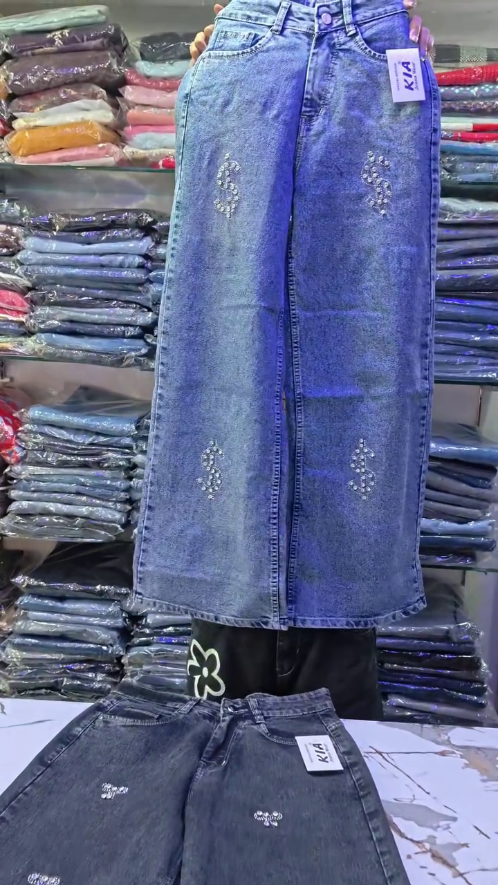 Dark Washed Wide-Leg Denim Jeans with All-Over Minimal Rhinestone Butterfly Embellishments πŸ¦‹βœ¨