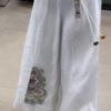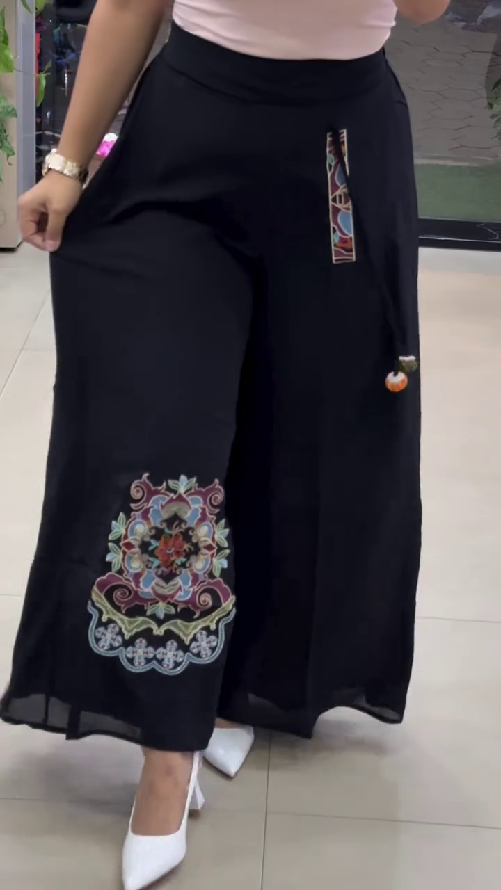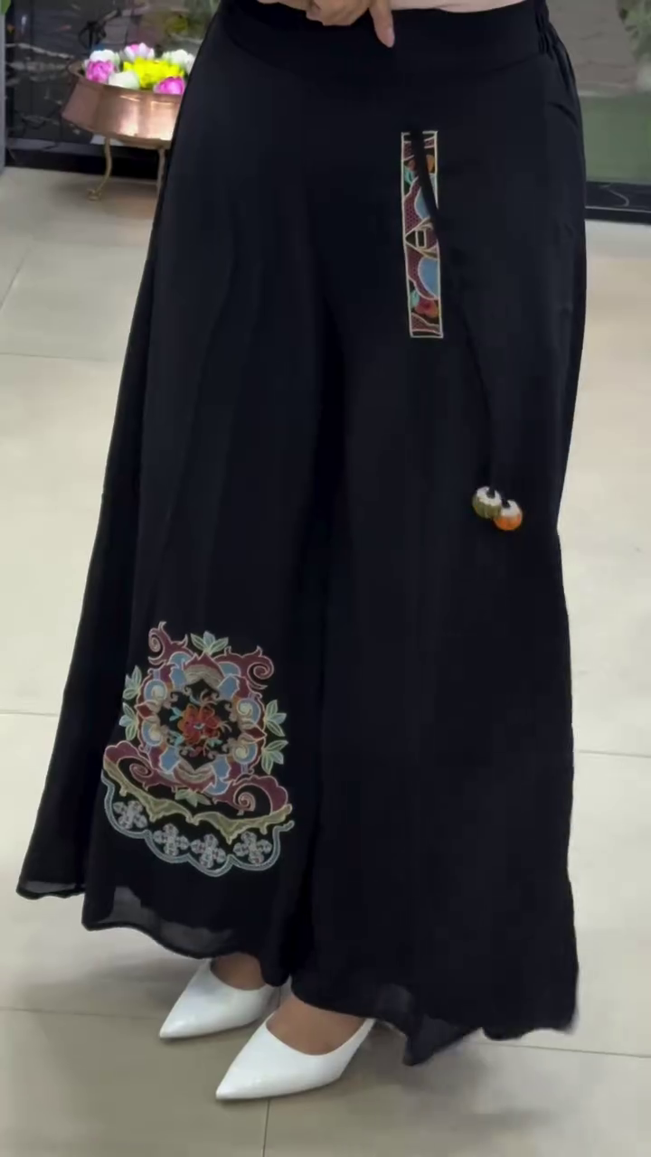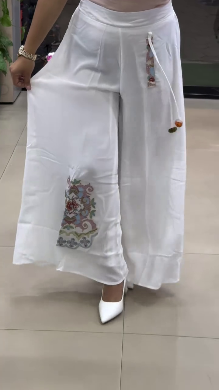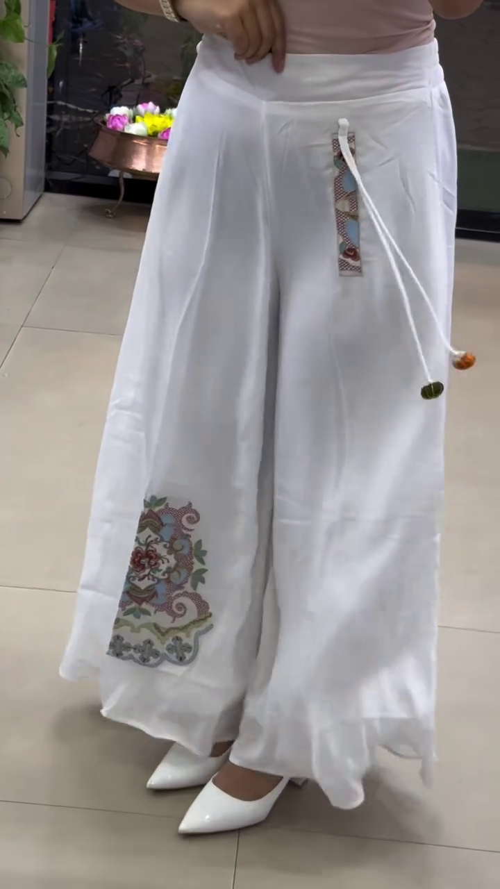 These flowy white wide-leg palazzo pants π€ feature a soft elastic waistband with adjustable drawstring π for maximum comfort. A beautiful ethnic floral embroidery patch πΊ enhances the lower leg area, adding traditional charm β¨. The relaxed wide-leg silhouette ensures breathability π¬οΈ and effortless movement π. Perfect for pairing with kurtis, crop tops, or festive blouses π for casual or semi-festive occasions π.