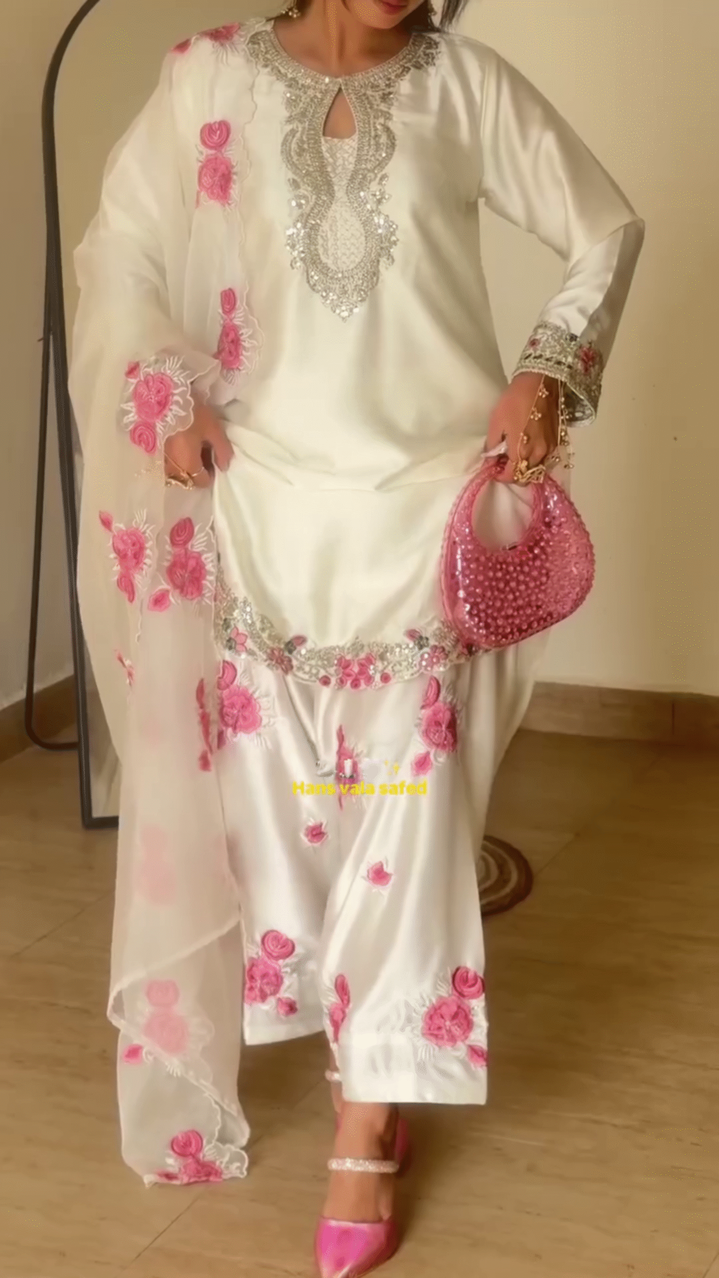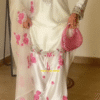 This graceful ivory white three-piece ethnic suit set features delicate pink floral embroidery, creating a soft feminine aesthetic that feels timeless and elegant.