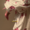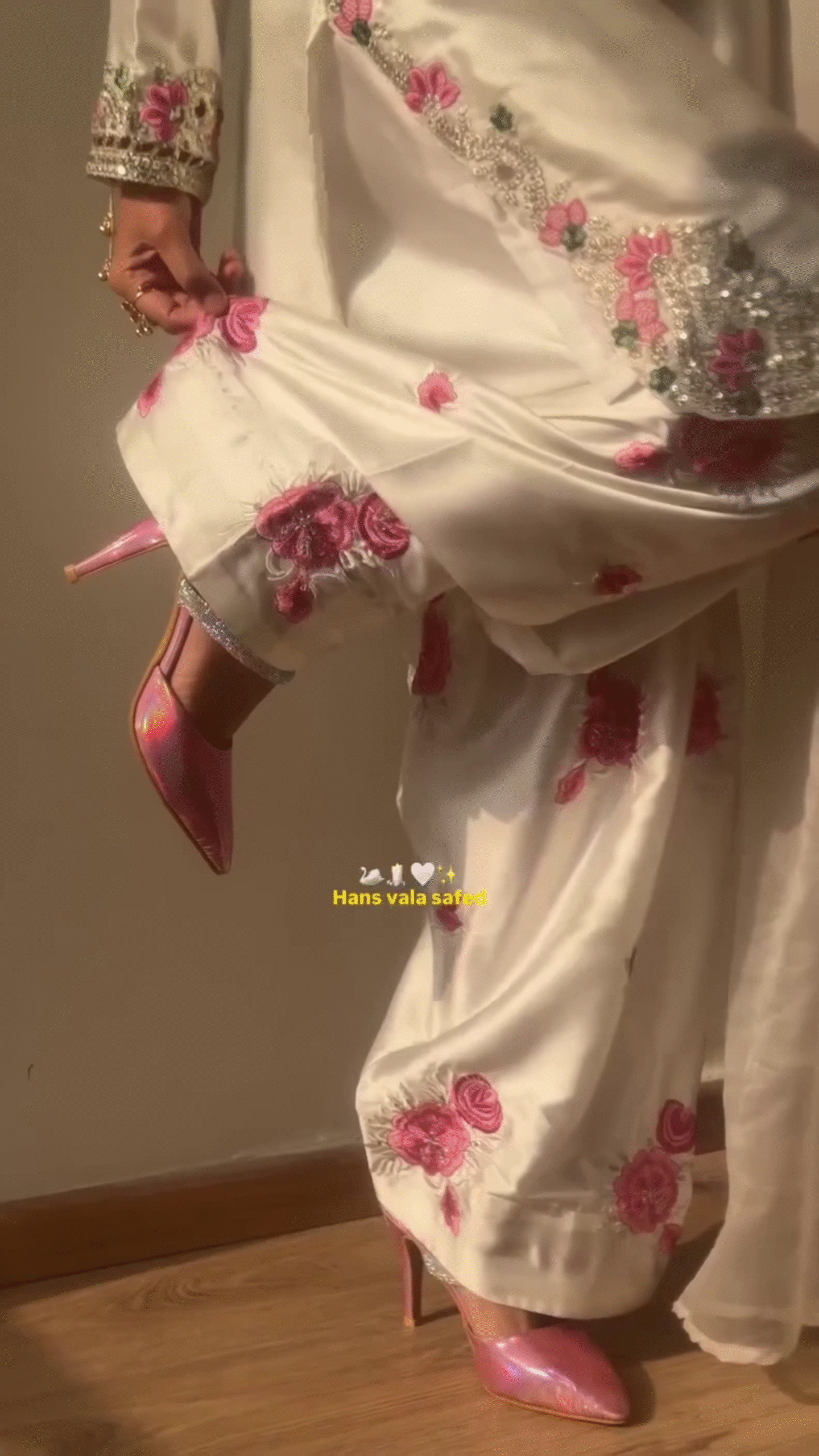 Beautiful pink floral embroidery accents appear on the sleeves, hemline, and throughout the outfit, creating a harmonious botanical theme.
