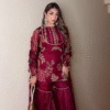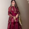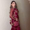 This breathtaking ensemble features a deep maroon kurti beautifully embellished with intricate golden embroidery ✨🌺. The embroidery includes floral motifs, structured patterns, and shimmering threadwork that adds richness to the entire look. The kurti is designed with full sleeves made from lightweight sheer fabric, decorated with matching motifs that create a royal and festive charm 👑💫.