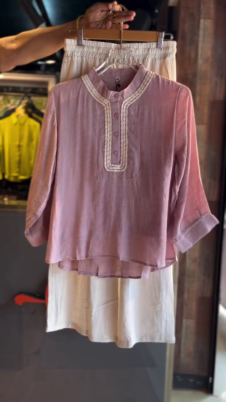 Radiate calm sophistication in this Mauve Pintuck Cotton Blouse paired with Ivory Palazzo Pants, a perfect ode to subtle pastel charm. 🌷 The blouse, crafted from soft crinkled cotton, features delicate pintuck detailing around the placket and collar, framed by contrast ivory piping — a true blend of simplicity and grace.