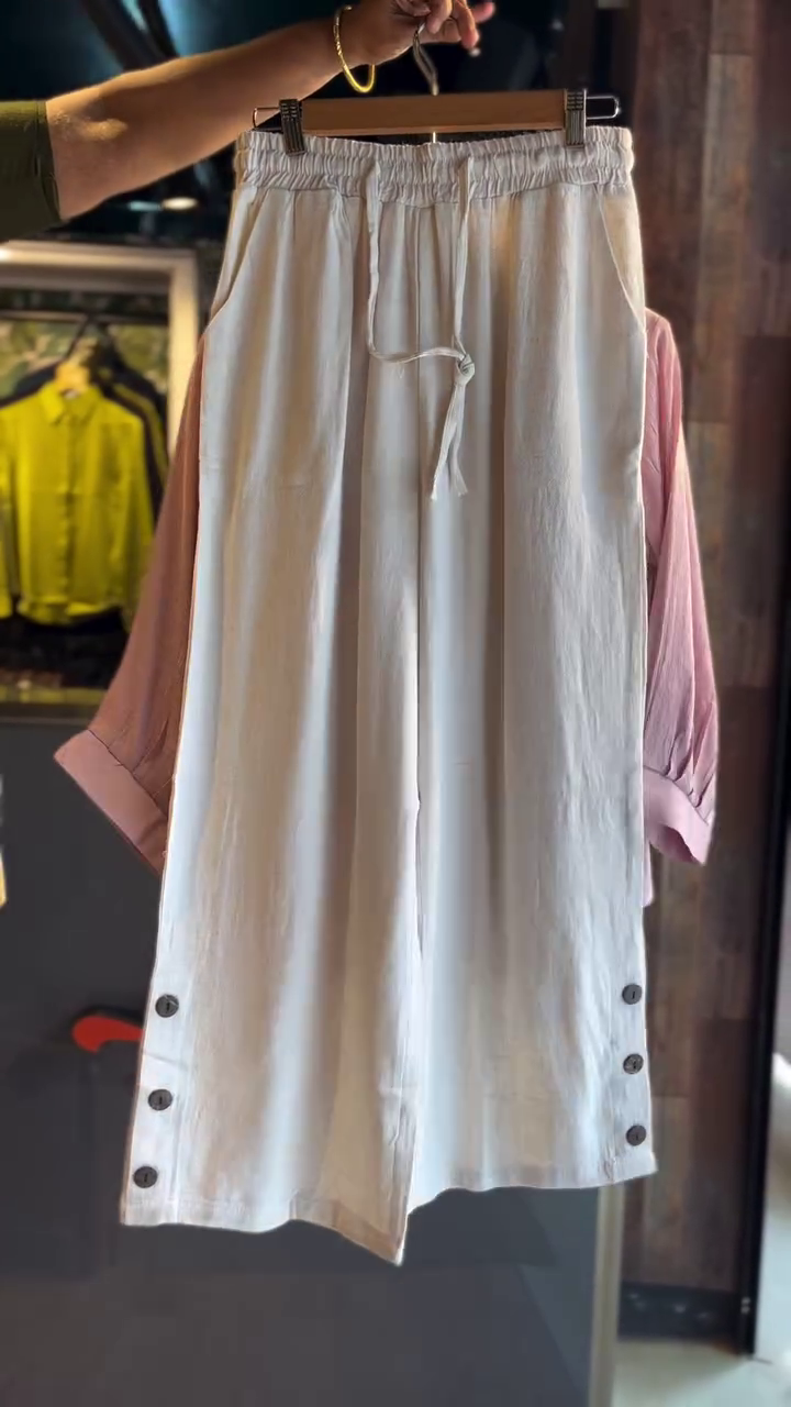 The Ivory Palazzo complements the top with its airy, fluid drape. Made from pure cotton-linen blend, it’s designed for unrestricted comfort while maintaining structure. Together, this outfit delivers a balanced fusion of elegance and ease.