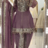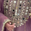 This luxurious three-piece traditional suit set showcases exquisite craftsmanship with mirror work and intricate embroidery, making it a perfect outfit for elegant festive occasions.