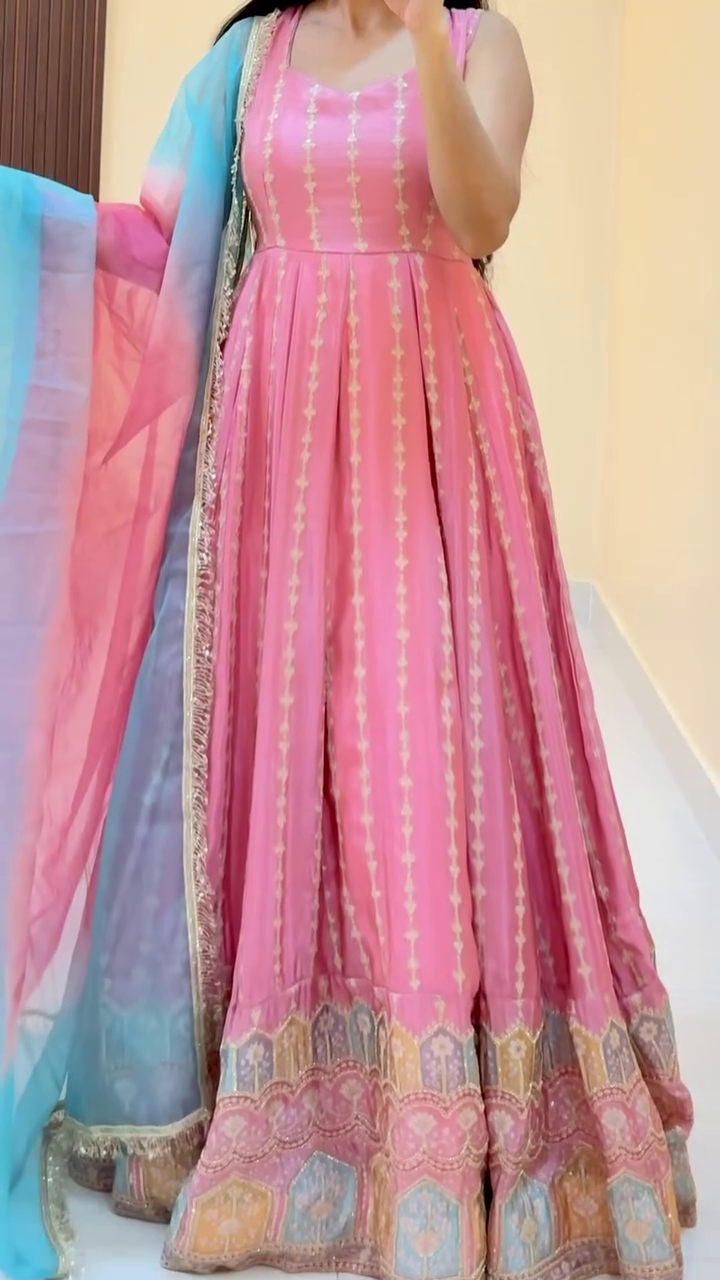 Step into a world of soft elegance with this breathtaking Pastel Dream Weave Flared Anarkali Set in shades of baby pink and sky blue πΈππ. The beautifully crafted Anarkali features delicate vertical woven patterns that elongate the silhouette and add a graceful shimmer with every movement β¨π.
