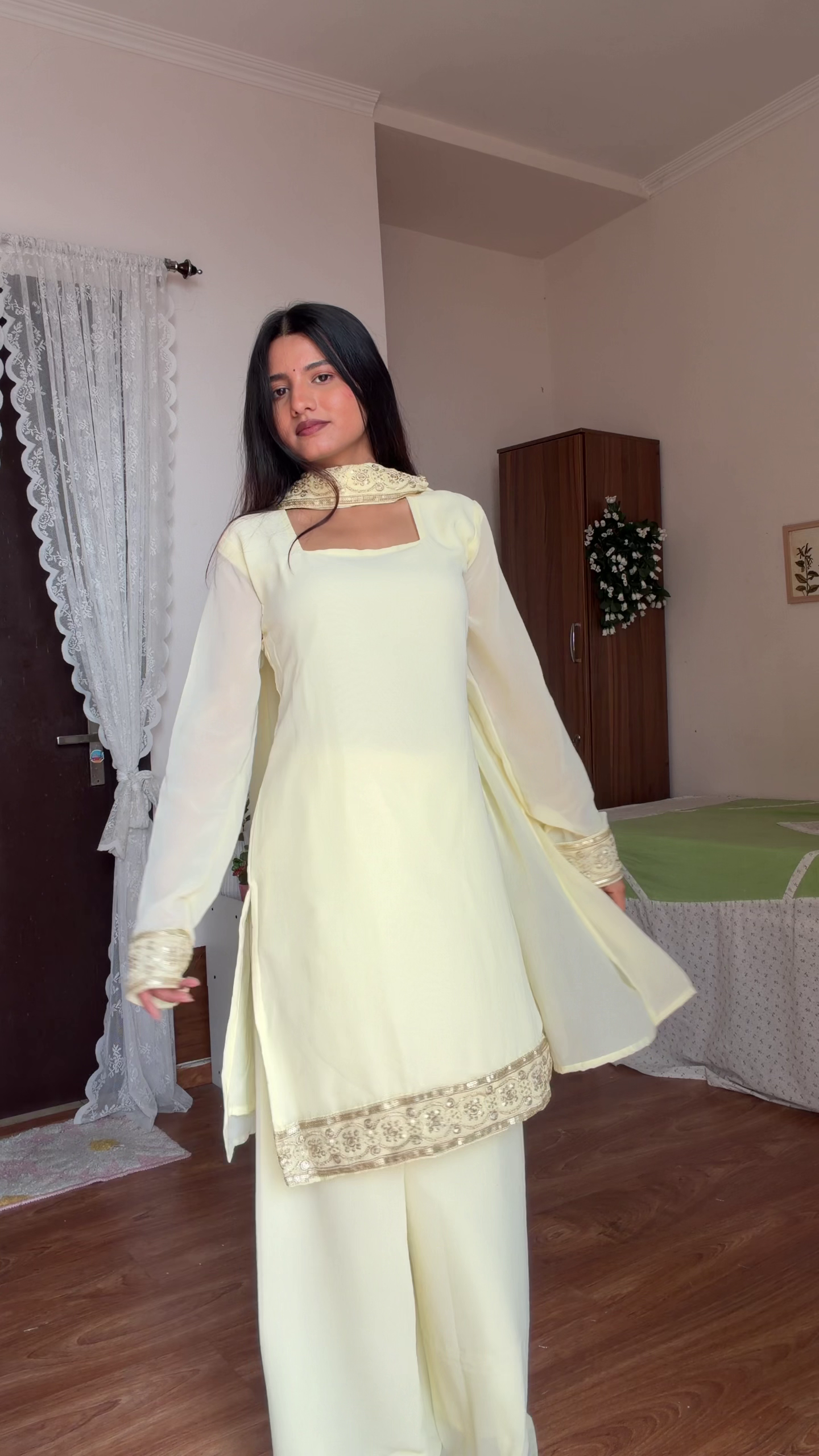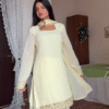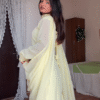 This pastel lemon yellow suit 💛 radiates simplicity and elegance. Designed with a straight silhouette 👗, it features sheer full sleeves 🌼 and beautifully embroidered gold border detailing along the neckline and hem ✨.