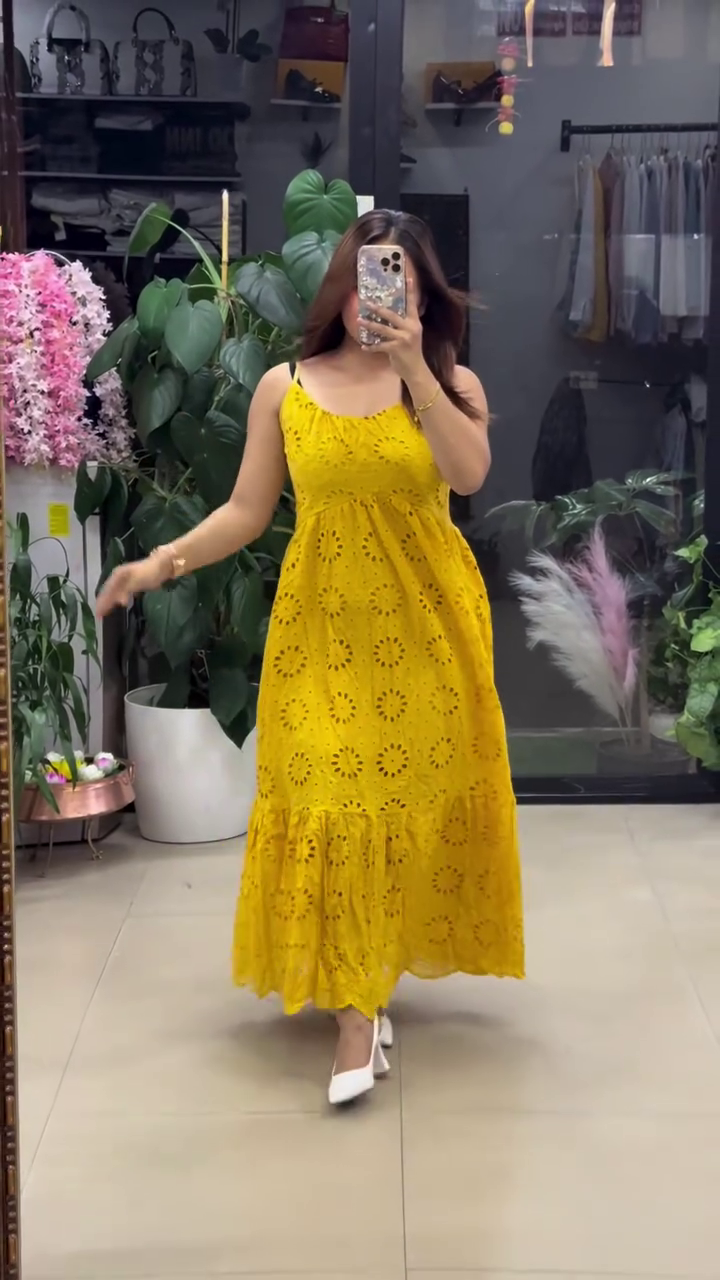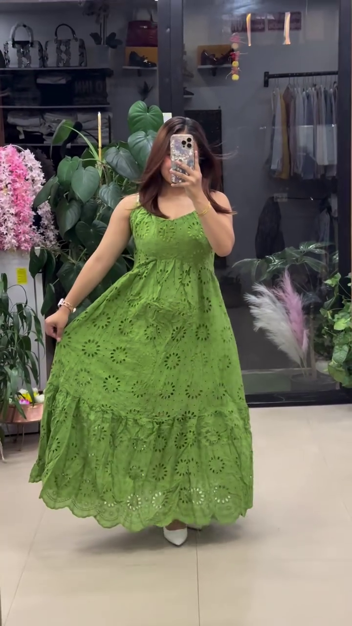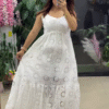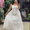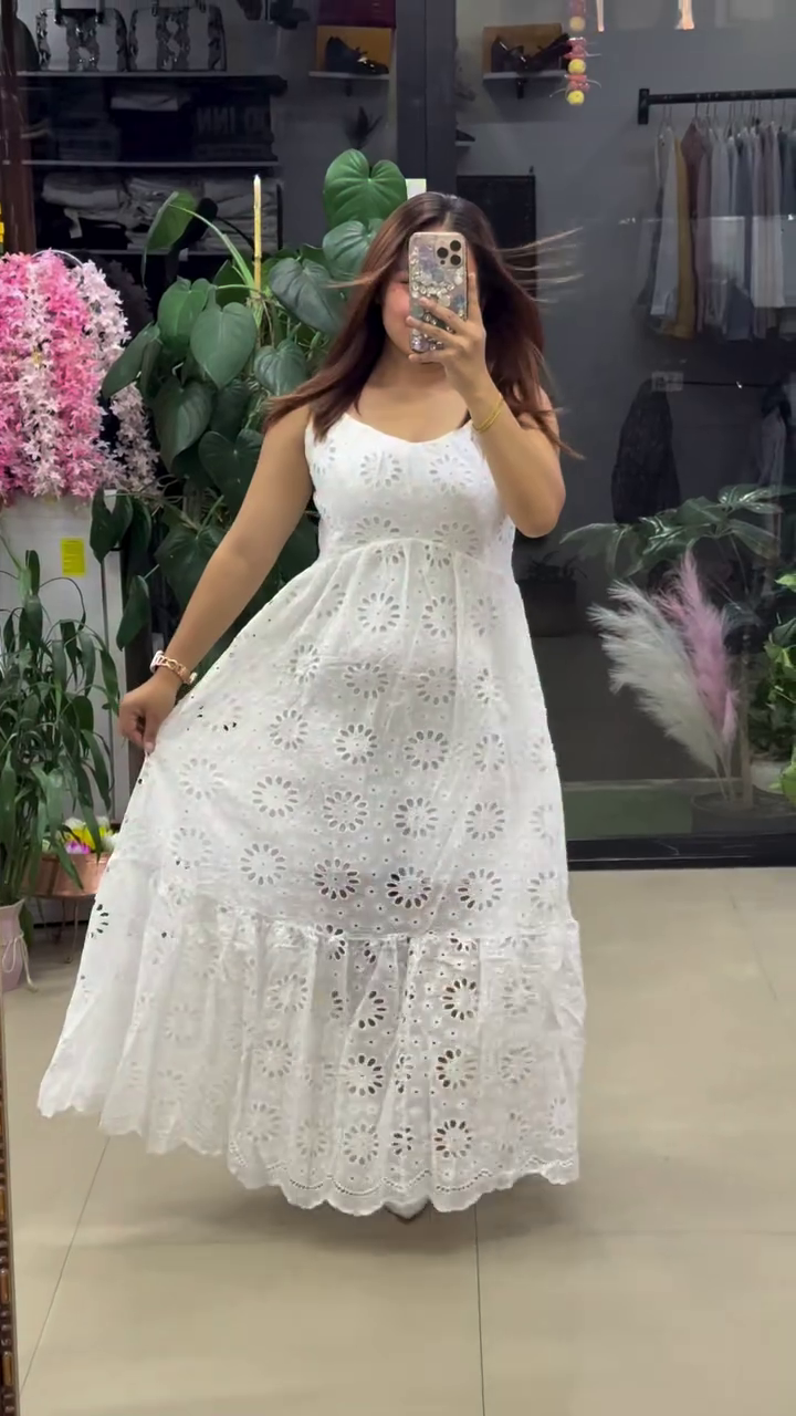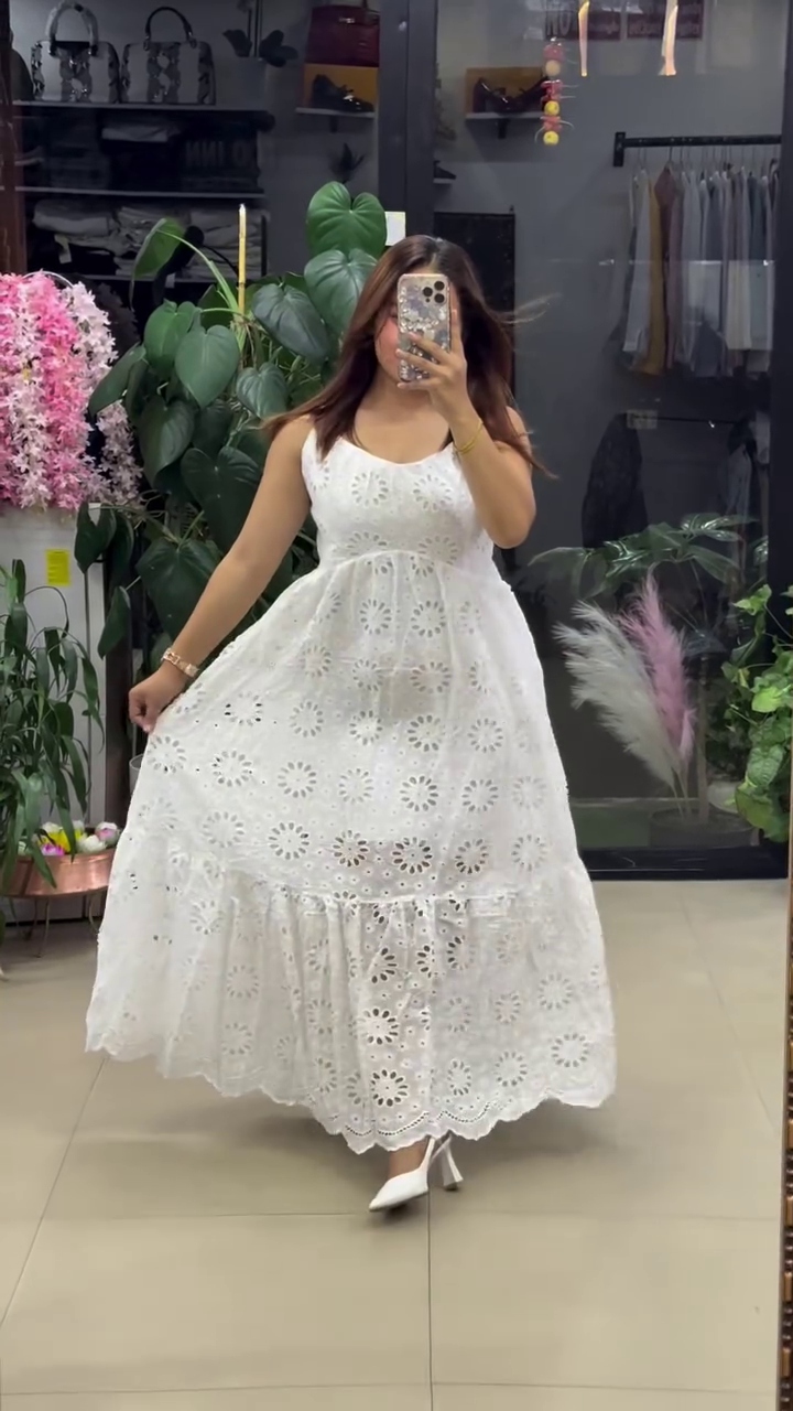 This elegant white maxi dress 🀍 features intricate floral eyelet embroidery 🌼 throughout the fabric, giving it a timeless summer vibe 🌞. The sleeveless design πŸ‘— and fitted bodice offer a flattering silhouette, while the flowy tiered hem 🌬️ with scalloped detailing adds grace and movement πŸ’ƒ. Lightweight and breathable 🌿, it’s perfect for vacations πŸ–οΈ, garden parties 🌷, festive wear πŸŽ‰, or casual chic styling. Pair with heels or flats for a classy finish πŸ‘ .
