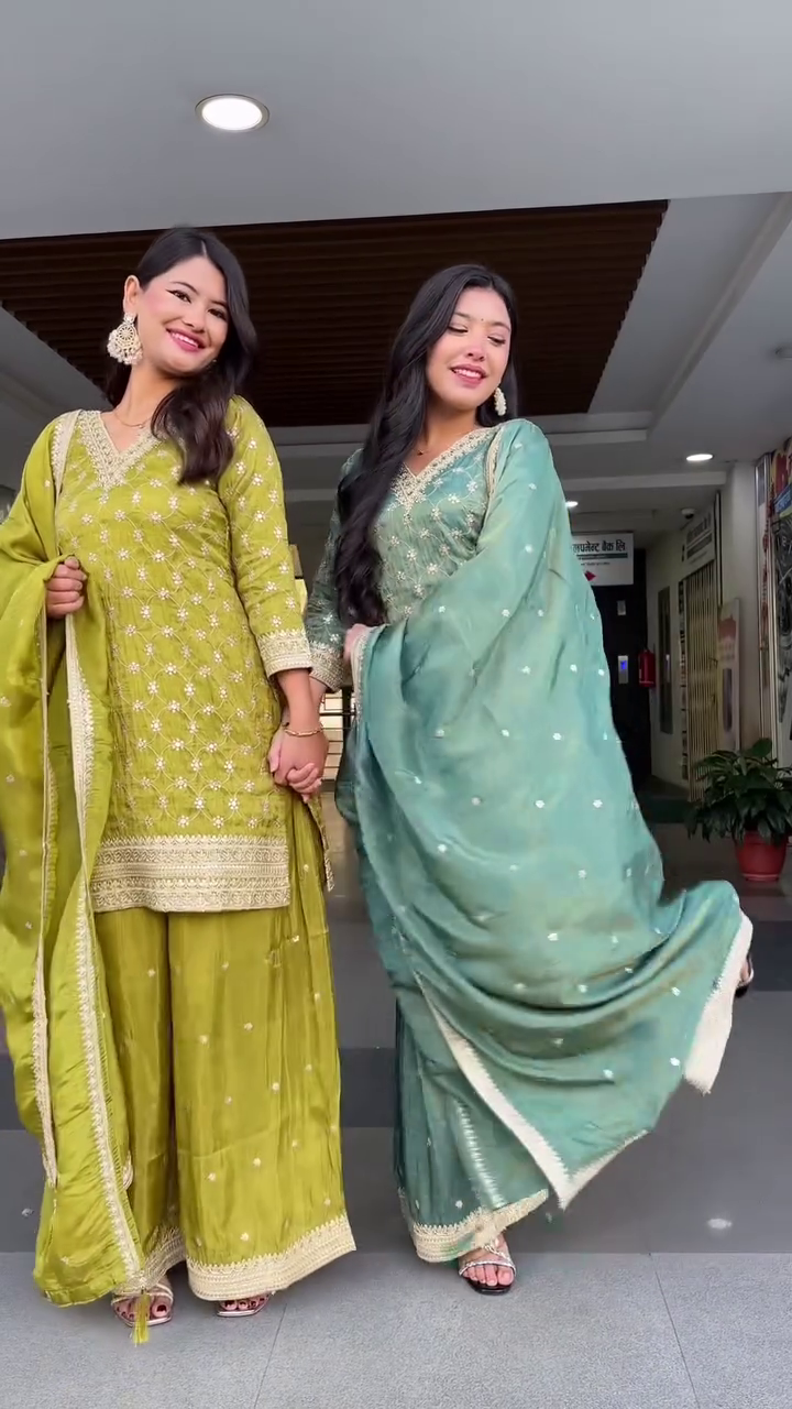 Paired with wide-flared shararas made from a flowy, glossy fabric, the outfit creates a dreamy silhouette with every step, swirl, and twirl ππ. The sharara falls elegantly, adding movement and charm while staying incredibly lightweight and breathable.