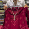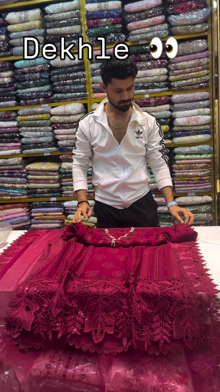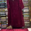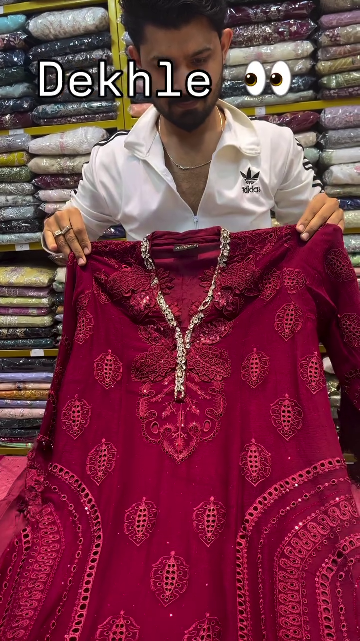 This luxurious burgundy outfit ❤️ features detailed heavy embroidery and elegant cutwork patterns 🌹 throughout the front panel and hemline. The neckline is adorned with subtle embellishment 💎 adding richness without overpowering the design.