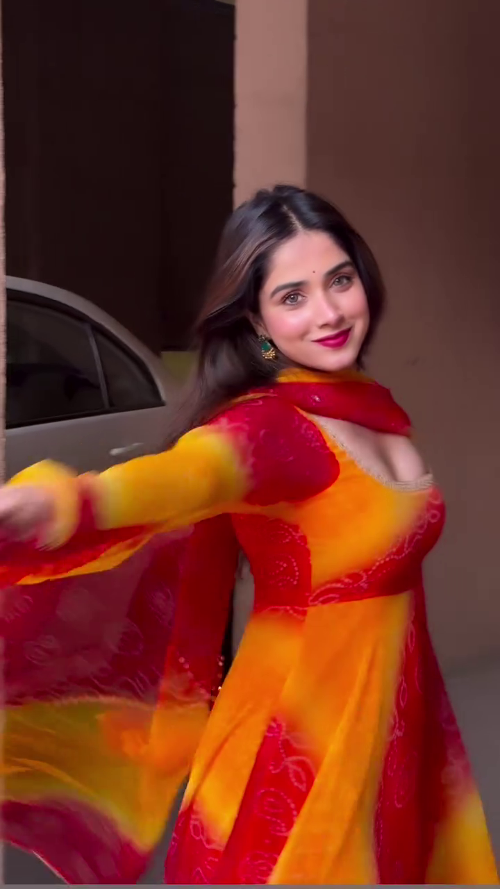The matching dupatta completes the ensemble with swirling red patterns that dance in motion—perfect for twirling, posing, or capturing stunning slow-motion videos 📸💃🔥. Its lightweight nature makes it ideal for haldi, mehendi, festive evenings, casual functions, or vibrant cultural gatherings.