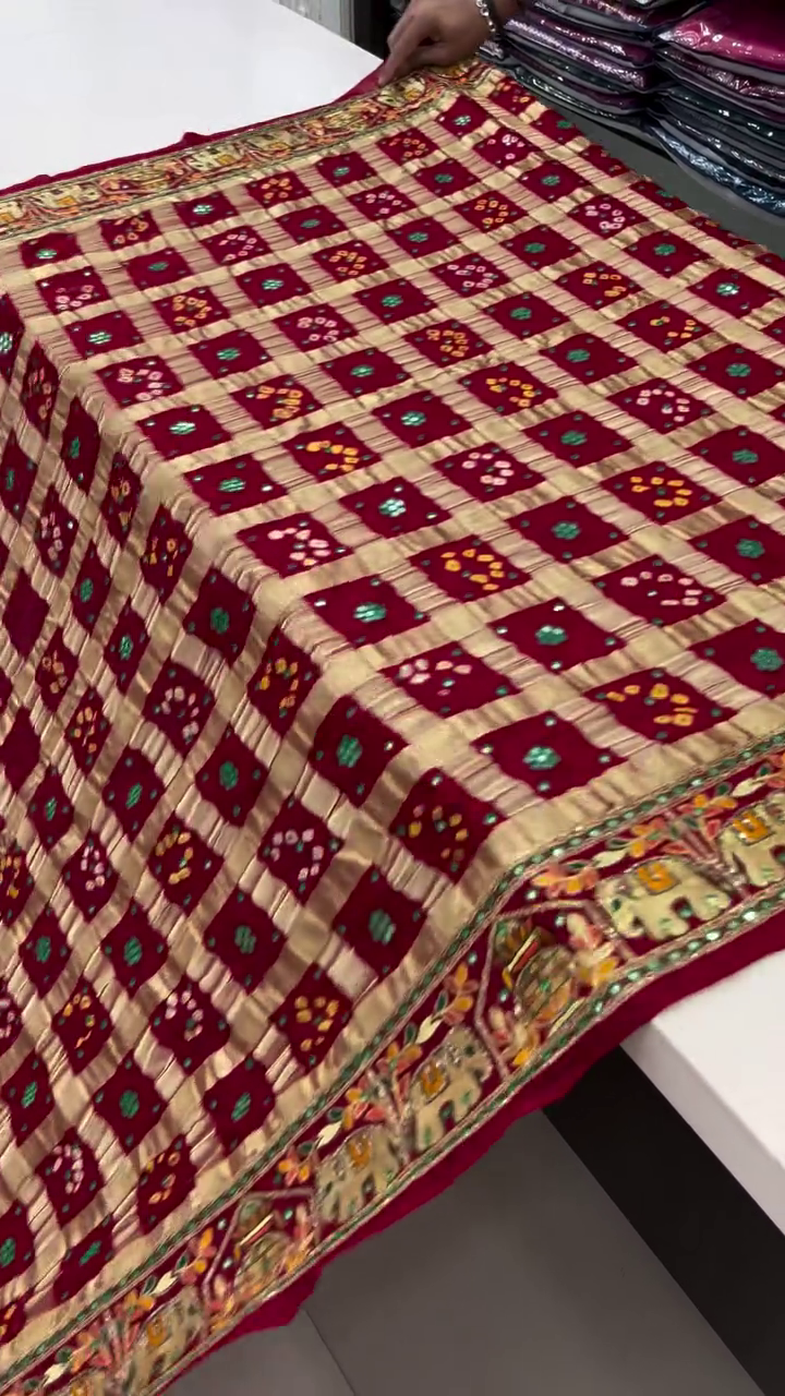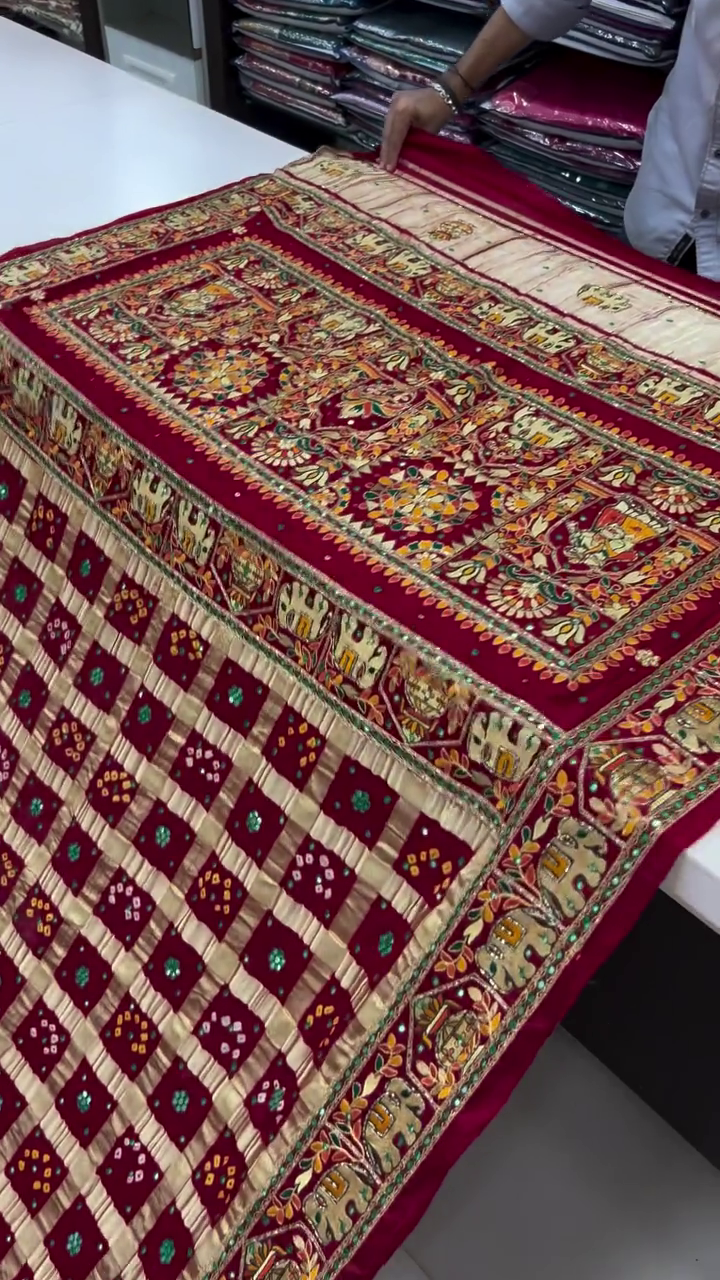 A **Gharchola saree** is a traditional Indian saree, originating from Gujarat, and is deeply rooted in the culture and customs of the region. It is particularly popular during weddings and religious ceremonies due to its symbolic and aesthetic significance.